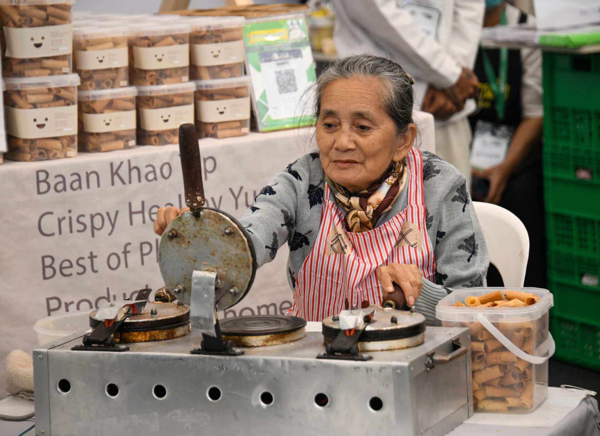 และร้านค้าชุมชนที่มาพร้อมสินค้าคุณภาพมากมายเพื่อสร้างรายได้สู่ชุมชน ที่งานนี้ยังมีทีเด็ดร้านทองม้วนเจ้าอร่อยที่คุณยายเจ้าของร้านมานั่งทำให้เห็นวิธีการทำ การม้วนแบบสด ๆ