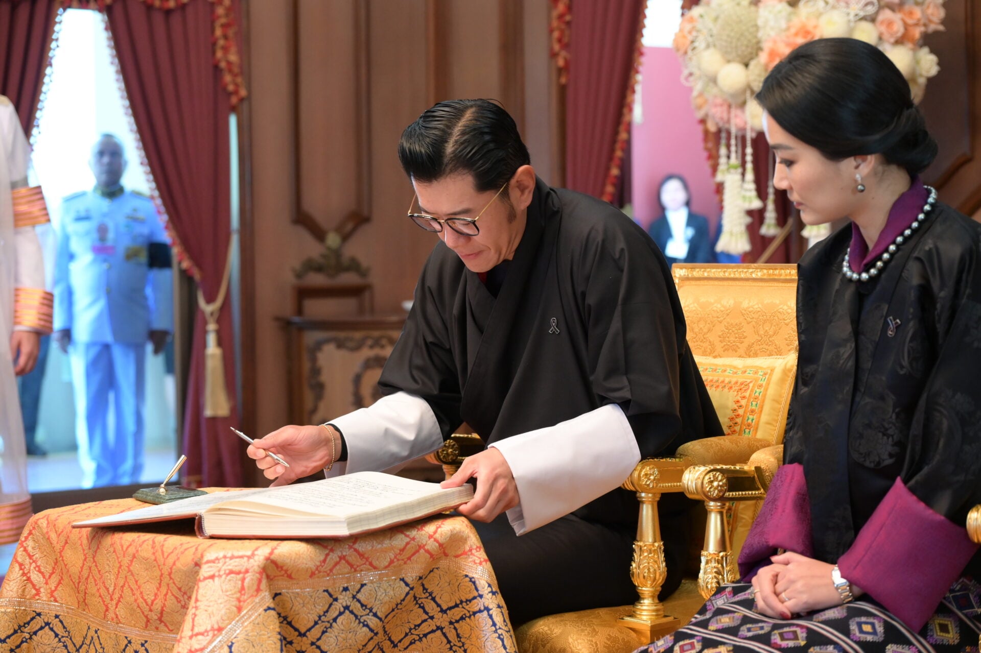 สมเด็จพระราชาธิบดีจิกมี เคเซอร์ นัมเกล วังชุก และสมเด็จพระราชินีเจตซุน เพมา วังชุก เสด็จเข้าห้องรับรอง หอประชุมจุฬาฯ ทรงลงพระปรมาภิไธยและพระนามาภิไธยในสมุดเยี่ยม ศ. (พิเศษ) ดร.สุรเกียรติ์ เสถียรไทย นายกสภาจุฬาลงกรณ์มหาวิทยาลัยทูลเกล้าฯ ถวายฉลองพระองค์ครุยดุษฎีบัณฑิตกิตติมศักดิ์แด่สมเด็จพระราชาธิบดีจิกมี เคเซอร์ นัมเกล วังชุก ศ.ดร.วิเลิศ ภูริวัชร อธิการบดีจุฬาฯ ทูลเกล้าฯ ถวายฉลองพระองค์ครุยดุษฎีบัณฑิตกิตติมศักดิ์แด่สมเด็จพระราชินี เจตซุน เพมา วังชุก