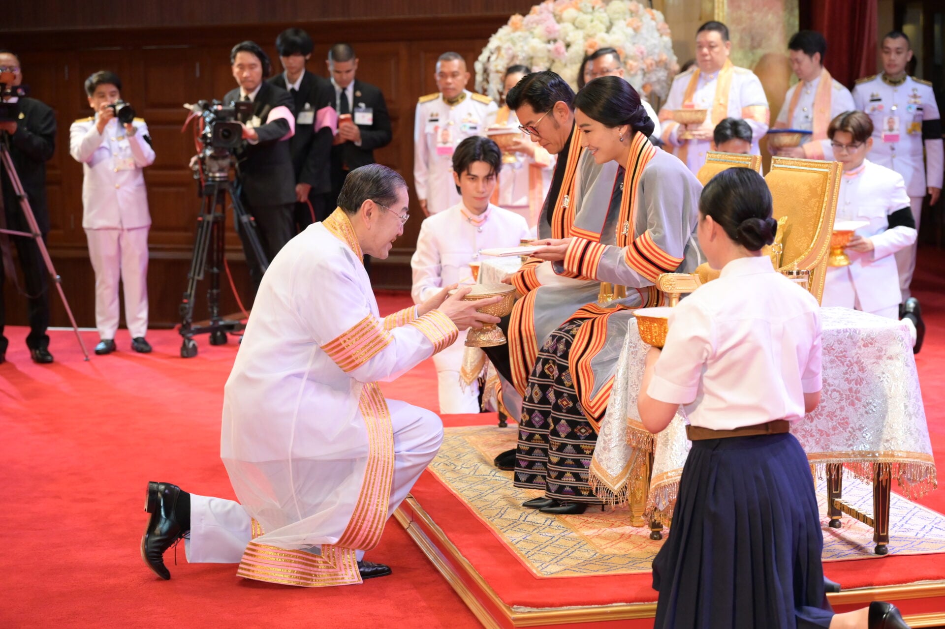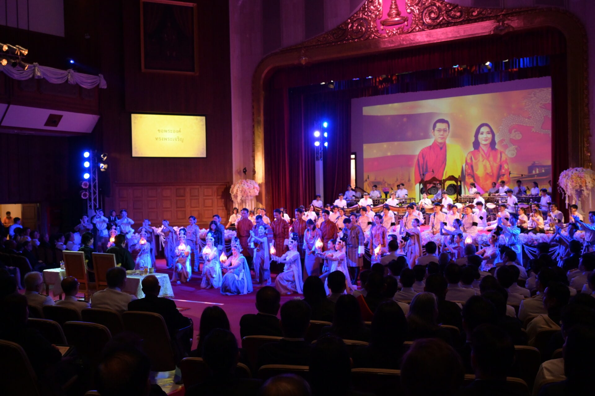 หลังจบการแสดง สมเด็จพระราชาธิบดีจิกมี เคเซอร์ นัมเกล วังชุก พระราชทานช่อดอกไม้แก่ อ.วรรธนะ ตันเจริญผล ผู้ฝึกซ้อมและอำนวยเพลง วงดุริยางค์เครื่องลมแห่งจุฬาลงกรณ์มหาวิทยาลัย และวงนักร้องประสานเสียง สโมสรนิสิตจุฬาฯ ดร.สิริชัยชาญ ฟักจำรูญ ศิลปินแห่งชาติ ผู้ฝึกซ้อมและปรับวงมหาดุริยางค์ไทยเยาวชนแห่งจุฬาลงกรณ์มหาวิทยาลัย (ChulaThaiYo) และวงดุริยางค์เครื่องลมแห่งจุฬาลงกรณ์มหาวิทยาลัย และ รศ.ดร.ยุทธนา ฉัพพรรณรัตน์ รองอธิการบดี ผู้ประพันธ์เรียบเรียงเพลง “รัตนบริบาลร่มเย็นมาช้านานทั้ง 2 แผ่นดิน” และปรับวงมหาดุริยางค์ไทยเยาวชนแห่งจุฬาลงกรณ์มหาวิทยาลัย (ChulaThaiYO) สมเด็จพระราชินี เจตซุน เพมา วังชุก พระราชทานช่อดอกไม้แก่นายกิตติพัชญ์ ตรีรัตน์ฤคเวท นิสิตคณะครุศาสตร์ จุฬาฯ ผู้แทนนักดนตรี และ น.ส.กุลนิษฐ์ เชี่ยวสกุล นิสิตคณะศิลปกรรมศาสตร์ จุฬาฯ ผู้แทนนักแสดง