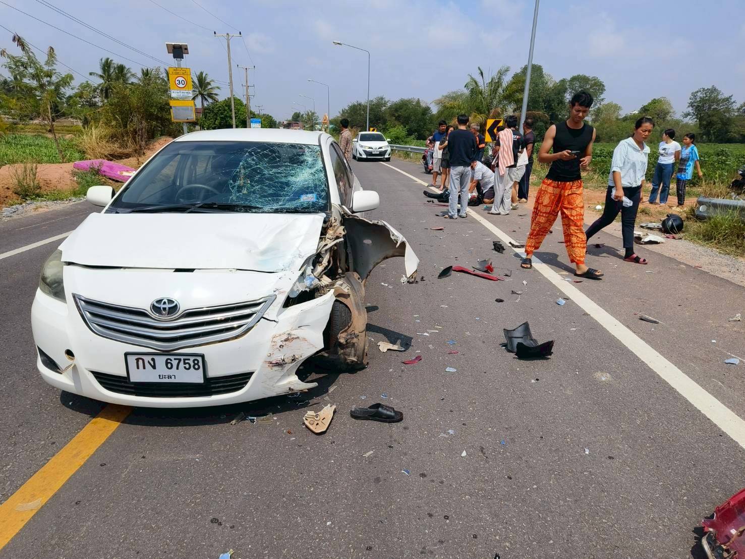 จยย. 2 กลุ่ม ชนสนั่น! กลางถนนสุวรรณภูมิ ดับ 2 เจ็บอีก 3