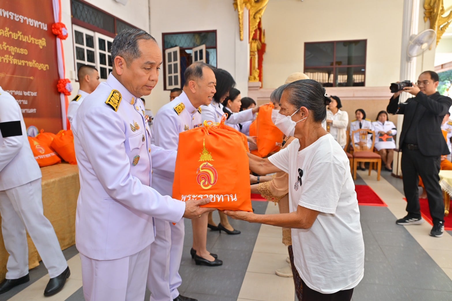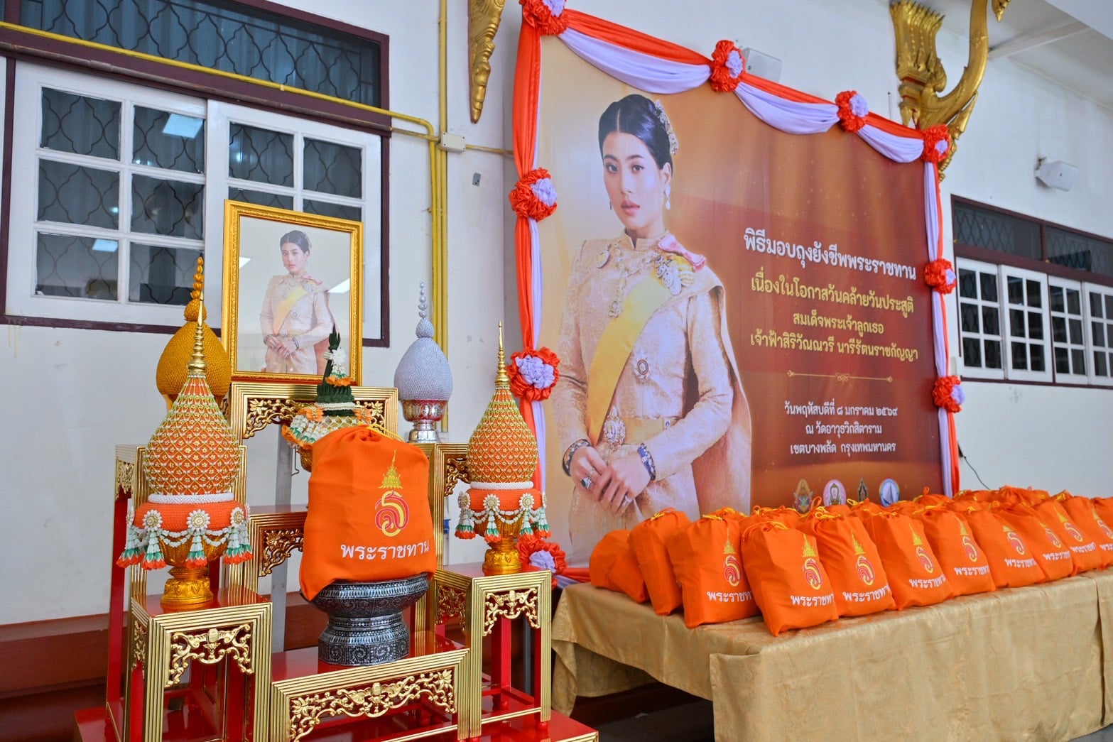 นายประสพ เรียงเงิน ปลัดกระทรวงวัฒนธรรม กล่าวต่อว่า นอกจากการเจริญพระพุทธมนต์ด้วยการสวดพระปริตรของพระสงฆ์ 10 รูปแล้ว ยังมีการมอบถุงยังชีพ เพื่อถวายพระกุศลแด่พระองค์ท่าน ซึ่งถุงยังชีพดังกล่าวพระองค์ท่านทรงพระราชทานมา เพื่อให้เชิญมอบแก่ผู้สูงอายุ ผู้ด้อยโอกาส ผู้พิการ และผู้ป่วยติดเตียง ที่อาศัยอยู่ในชุมชนวัดอาวุธวิกสิตาราม โดยผู้นำชุมชนและสำนักงานเขตบางพลัด เป็นผู้คัดเลือกมาจำนวน 40 คน ทั้งการพระราชทานพระอนุญาต เชิญอักษรพระนามาภิไธย ส.ร.ประดิษฐานบนพัดรอง จำนวน 11 ด้าม และประดิษฐานบนย่าม จำนวน 11 ใบ เพื่อถวายประธานสงฆ์และพระสงฆ์เจริญพระพุทธมนต์ถวายพระกุศล นับว่าเป็นกุศลมงคลที่พวกเราชาวไทยจะได้น้อมเกล้าน้อมกระหม่อมถวายพระกุศล เนื่องในโอกาสวันคล้ายวันประสูติของพระองค์ท่าน ซี่งปีนี้ตรงกับวันพฤหัสบดีที่ 8 มกราคม 2569