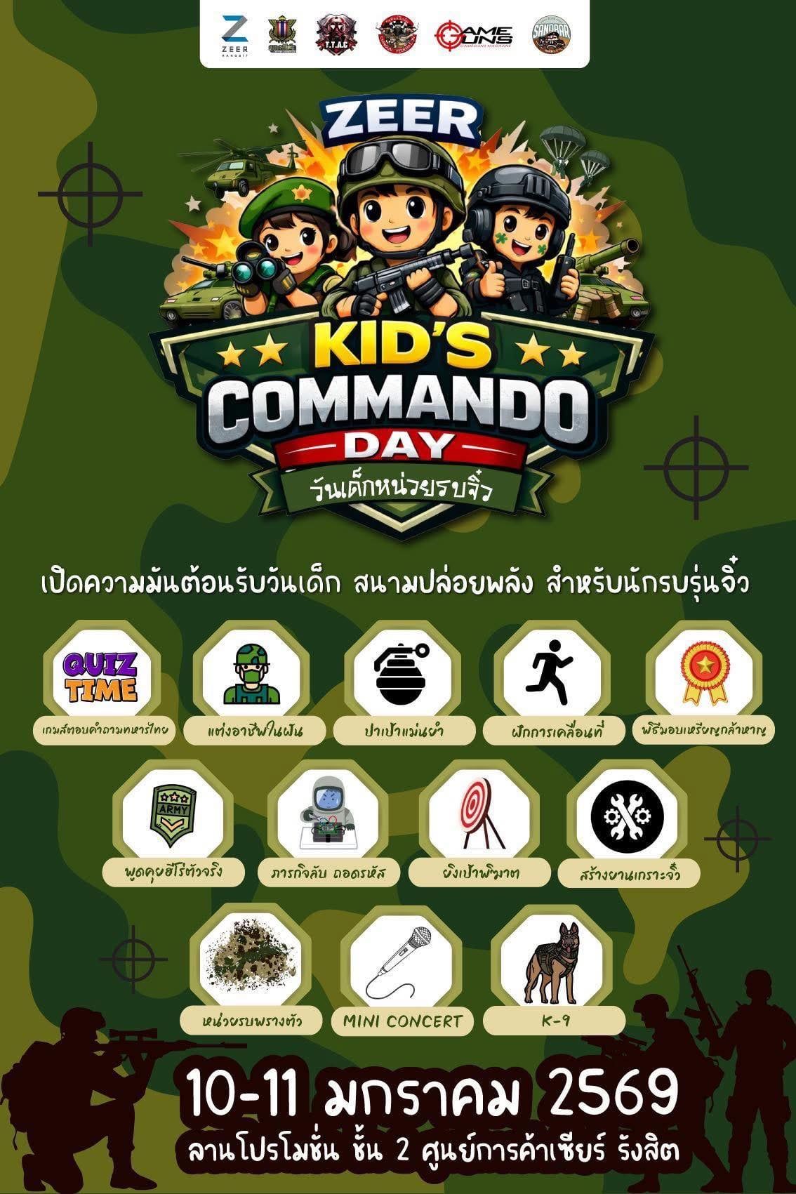 เซียร์ รังสิต จัดงานวันเด็ก2569 แบบให้เด็กๆ ได้พบกับความสนุกสุดท้าทายในงาน “ZEER KID’S COMMANDO DAY” สนามปล่อยพลังสำหรับนักรบตัวน้อยที่บอกเลยว่าห้ามพลาด เพราะปีนี้ขนกองทัพกิจกรรมมาเพียบ อาทิ แต่งชุดอาชีพในฝัน ยิงเป้าพิฆาต & ปาเป้าแม่นยำ ภารกิจลับถอดรหัส โชว์สุนัขทหาร K-9 สุดเท่ สร้างยานเกราะจิ๋ว & ฝึกการเคลื่อนที่ พร้อม Mini Concert และรับเหรียญกล้าหาญ! ไปด้วย งานนี้บอกเลยว่าน้องๆ จะได้สนุกแบบจัดเต็ม คุณพ่อคุณแม่เตรียมกล้องมาให้พร้อมแล้วพาน้องๆ มาเปิดประสบการณ์ใหม่ๆ งานมีตั้งแต่วันที่ 10-11 ม.ค. 2569 ณ ลานโปรโมชั่น ชั้น 2 เซียร์ รังสิต