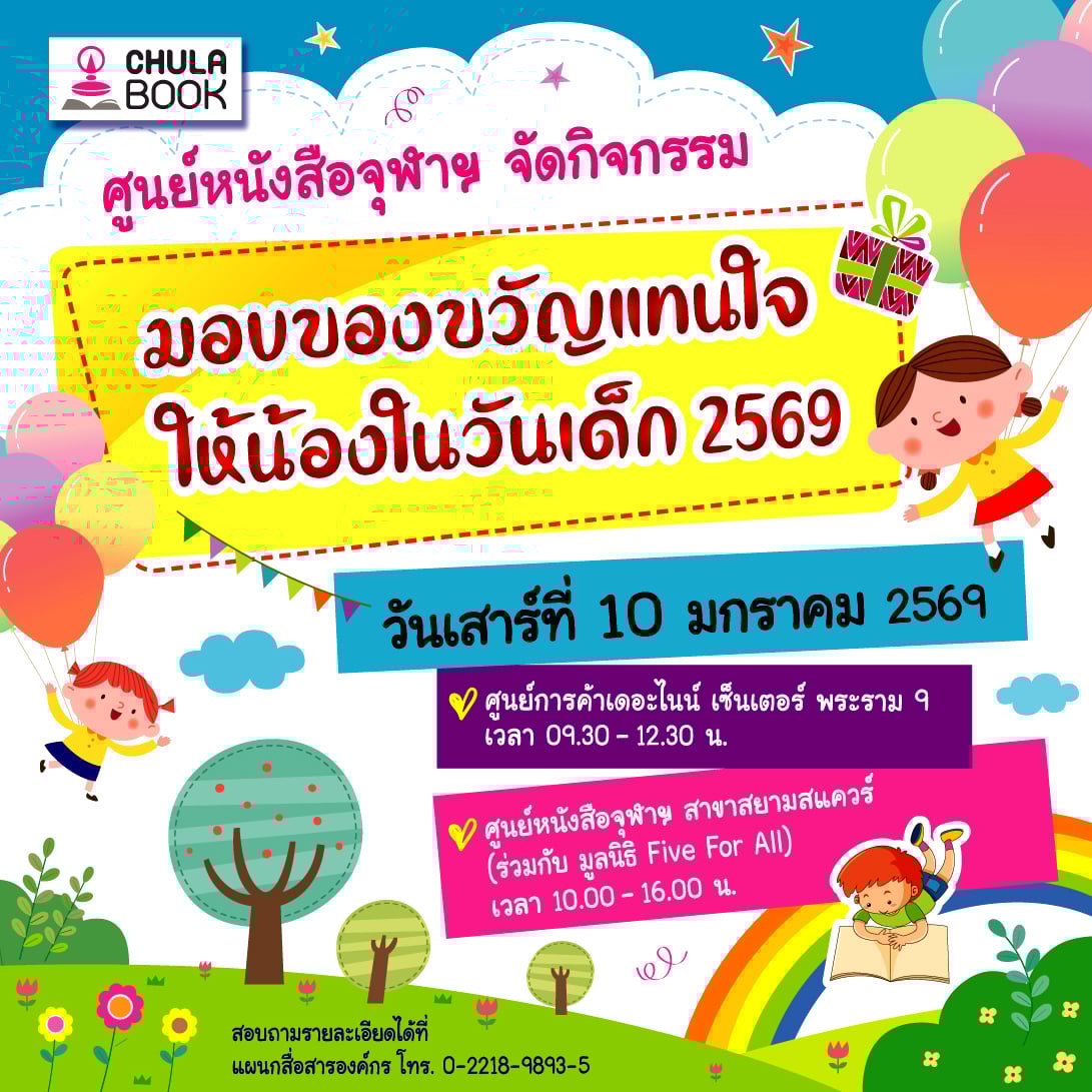 ศูนย์หนังสือจุฬาลงกรณ์มหาวิทยาลัย ขอเชิญคุณหนูๆ ร่วมงาน “มอบของขวัญแทนใจ ให้น้องในวันเด็ก” ในวันเสาร์ที่ 10 มกราคม 2569 เพื่อเปิดโอกาสให้คุณหนูๆ ได้แสดงออก และสนุกสนานไปกับกิจกรรมต่างๆ พร้อมของแจก ของรางวัลมากมาย โดยพบกันที่ ศูนย์การค้าเดอะไนน์ เซ็นเตอร์ พระราม 9 เวลา 09.30–12.30 น. และที่ โถงด้านหน้า ศูนย์หนังสือจุฬาฯ สาขาสยามสแควร์ อาคารวิทยกิตติ์ ชั้น G เวลา 10.00–16.00 น.