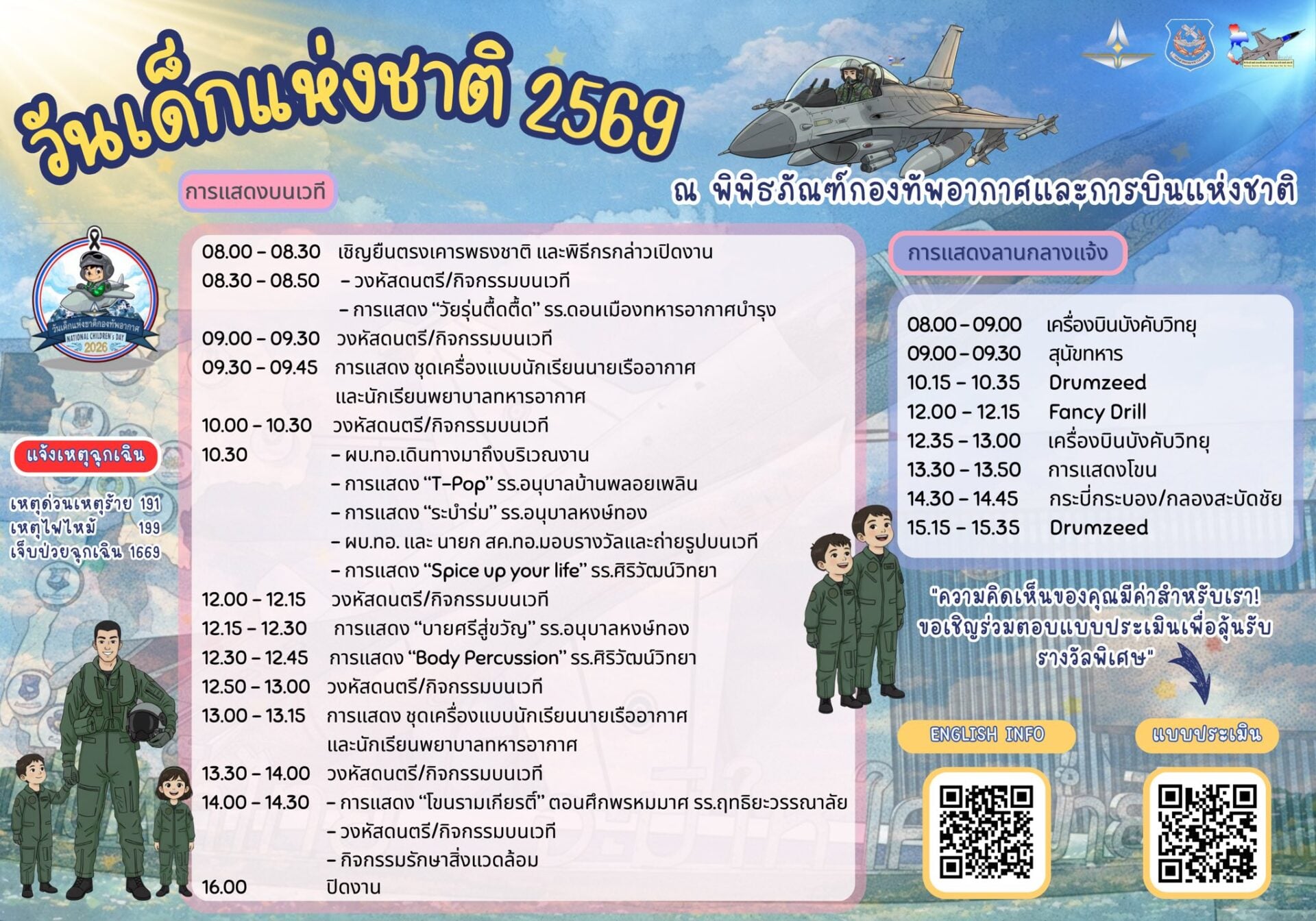 กิจกรรมยืนหนึ่งตลอดกาลกับงานวันเด็กกองทัพอากาศ ปีนี้จัดเต็มความอลังการให้น้องๆ ได้สัมผัสเครื่องบินของจริงแบบใกล้ชิดไฮไลต์ห้ามพลาด: ชมการแสดงการบิน (Air Show) สุดตื่นเต้น, สัมผัสอาวุธยุทโธปกรณ์ของจริง, บูธกิจกรรมแจกของรางวัล และซุ้มอาหารฟรี ข้อควรระวัง:ผู้เข้าชม ณ ฝูงบิน 601 กองบิน 6 ต้องลงทะเบียนล่วงหน้าผ่าน QR Code (ติดตามที่เพจ RTAF News)ต้องเตรียมบัตรประชาชน หรือ Passport เพื่อยืนยันตัวตนก่อนเข้างาน หมายเหตุ: กองบิน 1, 3, 4, 7 และ 21 งดจัดงาน ส่วนสถานทีที่จัดงาน ได้แก่ ฝูงบิน 601 กองบิน 6 (ดอนเมือง), พิพิธภัณฑ์กองทัพอากาศฯ, สนามบินเล็กทุ่งสีกัน และกองบินต่างจังหวัด