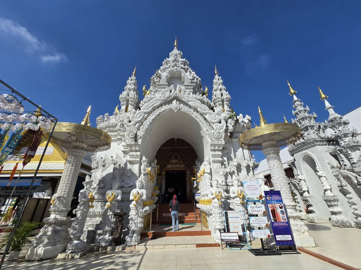 ไปต่อที่ วัดสันป่ายางหลวง วัดแห่งนี้โดดเด่นด้วยความงดงามของวิหาร จนได้รับการยกย่องให้ติดอันดับ 1 ใน 10 วิหารสวยของประเทศไทย ไฮไลต์คือพระวิหารพระเขียวโขง สร้างขึ้นเมื่อปี พ.ศ. 2536 ใช้เสาไม้ตะเคียนทองและไม้แดงจากไทย ลาว และพม่า ออกแบบโดยพระครูบาอินทร ผสมผสานศิลปะพื้นเมืองกับแนวคิดร่วมสมัยอย่างลงตัว หลังคาวิหารซ้อนหลายชั้น แฝงความหมายทางธรรมะ เมื่อเดินเข้าไปภายในจะพบพระเขียวโขง พระพุทธรูปแกะสลักจากหินแม่น้ำโขงอันงดงาม
