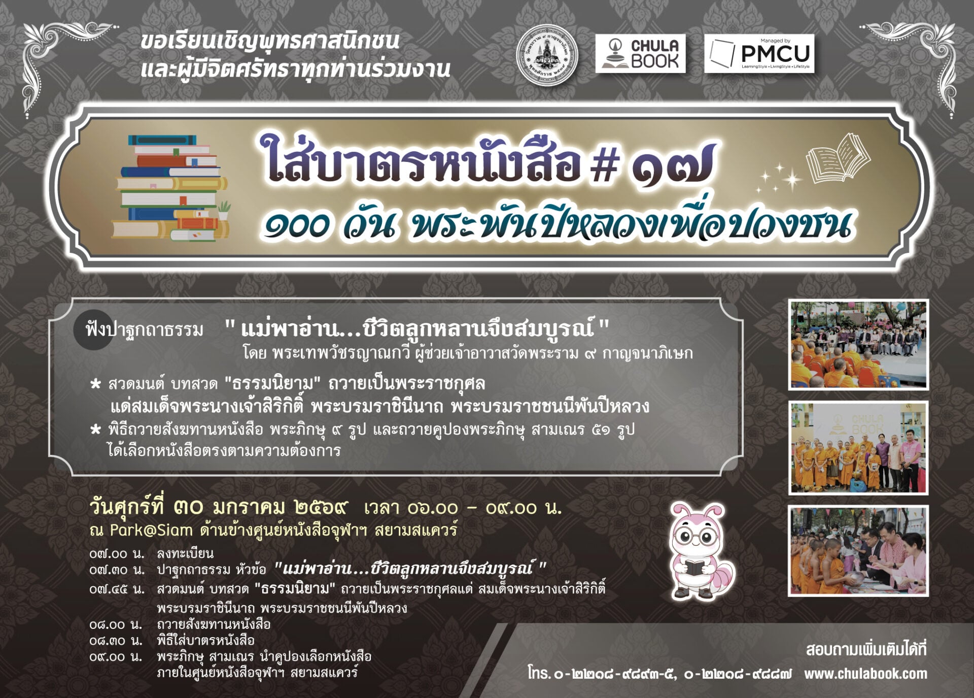 พร้อมฟังปาฐกถาธรรมหัวข้อ “แม่พาอ่าน…ชีวิตลูกหลานจึงสมบูรณ์” โดย พระเทพวัชรญาณกวี ผู้ช่วยเจ้าอาวาสวัดพระราม ๙ กาญจนาภิเษก และร่วมกันสวดมนต์บทสวด “ธรรมนิยาม” เพื่อถวายเป็น พระราชกุศล แด่สมเด็จพระนางเจ้าสิริกิติ์ พระบรมราชินีนาถ พระบรมราชชนนีพันปีหลวงในวันศุกร์ที่ 30 มกราคม 2569 เวลา 06.00 – 09.00 น. ณ Park @ Siam ด้านข้าง ศูนย์หนังสือจุฬาฯ สยามสแควร์ ผู้สนใจสอบถามเพิ่มเติมได้ที่ โทร.0-2218-9893-5