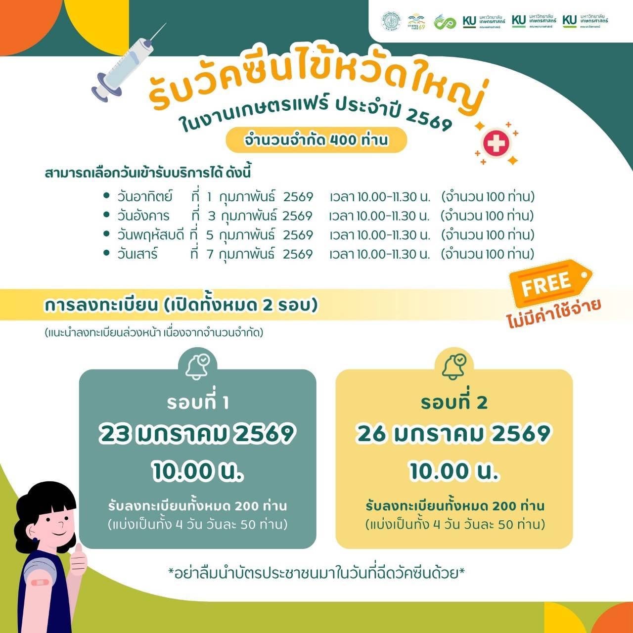 23 ม.ค.2569-มหาวิทยาลัยเกษตรศาสตร์ ตอกย้ำความแข็งแกร่งด้านวิทยาศาสตร์สุขภาพ (Health Sciences) บูรณาการความร่วมมือระหว่าง คณะแพทยศาสตร์ คณะพยาบาลศาสตร์ และคณะเภสัชศาสตร์ จัดกิจกรรมบริการวิชาการแก่ประชาชน เปิดให้บริการฉีดวัคซีนป้องกันโรคไข้หวัดใหญ่โดยไม่เสียค่าใช้จ่าย เพื่อเสริมสร้างภูมิคุ้มกันและสุขภาวะที่ดีให้แก่สังคม ภายในงานเกษตรแฟร์ ประจำปี 2569