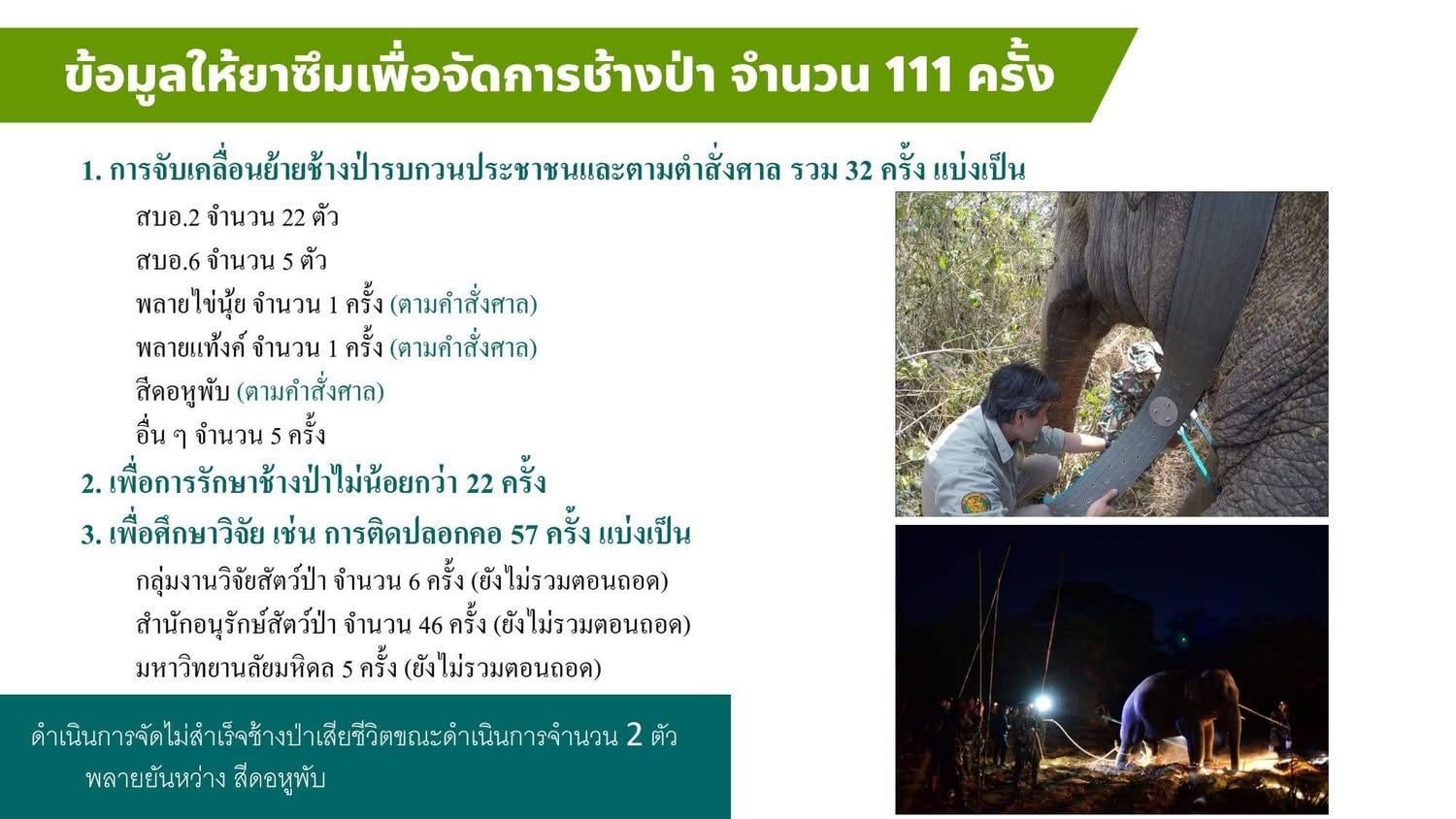 นางสาวกิตติยาภรณ์ เอี่ยมสะอาด สัตวแพทย์ประจำกรมอุทยานฯ ชี้แจงประเด็นการใช้ยาและผลชันสูตรว่า “เรายิงยาซึมในปริมาณที่คำนวณจากน้ำหนักตัว 2-2.5 ตัน และความสูง 2.44 เมตร ซึ่งสอดคล้องกับวัยเจริญพันธุ์ของช้างช่วงอายุ 15-20 ปี โดยมีการให้ยาซึม 4 เข็ม แต่ระหว่างการเคลื่อนย้าย ช้างมีอาการตื่นตัวผิดปกติและร่างกายทรุดลงอย่างรวดเร็ว แม้ทีมสัตวแพทย์จะเข้าช่วยเหลือฉุกเฉิน ทั้งการให้ยาแก้ฤทธิ์ยาซึม จำนวน 1 เข็ม รวมเป็น 5 เข็ม และการกู้ชีพ (CPR) แต่ไม่สำเร็จ ผลชันสูตรเบื้องต้นพบว่าเกิดจากภาวะทางเดินหายใจล้มเหลวเนื่องจากการสำลักอาหารอุดตันที่หลอดลม ซึ่งเป็นเหตุสุดวิสัยที่เกิดจากความเครียดสะสม”