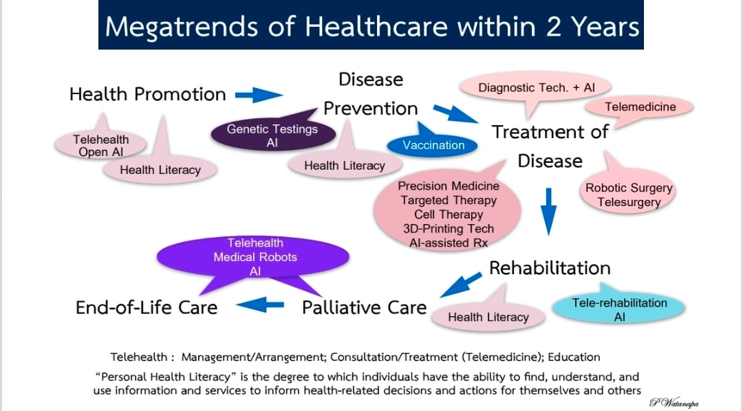 ศ. ดร.นพ.ประสิทธิ์ มีมุมมองว่า ดิจิทัลเทคโนโลยีและปัญญาประดิษฐ์จะมีบทบาทสำคัญในการปรับเปลี่ยนพฤติกรรมสุขภาพ โดยเฉพาะโรคไม่ติดต่อเรื้อรัง (NCDs) อย่างโรคเบาหวาน ซึ่งหัวใจสำคัญอยู่ที่การปรับพฤติกรรมมากกว่าการใช้ยา หากประชาชนสามารถเห็นผลกระทบของอาหารหรือพฤติกรรมของตนเองแบบทันทีผ่านข้อมูลวิเคราะห์จาก AI ก็จะช่วยสร้างแรงจูงใจให้เปลี่ยนแปลงได้จริง อีกแนวโน้มที่น่าสนใจคือการพัฒนาองค์ความรู้ด้านจุลชีพในลำไส้ ทั้งโพรไบโอติกส์และโพสต์ไบโอติกส์ ซึ่งมีบทบาทต่อภูมิคุ้มกันและโรคเรื้อรังจำนวนมาก อาหารไทยซึ่งถือเป็นซอฟต์พาวเวอร์สำคัญ อาจมีคุณค่าทางจุลชีววิทยาที่ช่วยส่งเสริมสุขภาพได้มากกว่าที่เราคิด หากมีการวิจัยและพัฒนาต่อยอดอย่างจริงจัง
