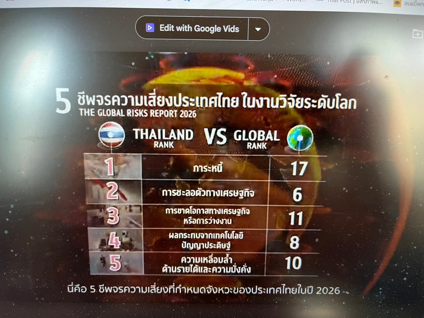 ความเสี่ยง 5 อันดับแรกของไทยในปี 2569เน้นย้ำถึงความกังวลด้านเศรษฐกิจอย่างชัดเจน อันดับ 1 คือหนี้สิน (Debt)ซึ่งครอบคลุมหนี้สาธารณะ หนี้องค์กร และหนี้ครัวเรือน ซึ่งความเสี่ยงนี้อยู่อันดับ 17ของโลก 2.ตามด้วยภาวะเศรษฐกิจถดถอย (Economic downturn) ขยายตัวต่ำกว่าศักยภาพที่ควรจะเป็น ขณะเดียวกันกำลังซื้อก็ยังโตไม่เต็มที่ 3.ภาวะการว่างงานหรือขาดโอกาสทางเศรษฐกิจ (Lack of economic opportunity orunemployment) 4.ผลกระทบด้านลบจากเทคโนโลยี AI (Adverse outcomes of artificial intelligence technologies) 5. ความเหลื่อมล้ำทางความมั่งคั่งและรายได้ ความกังวลเหล่านี้แตกต่างอย่างมากจากระดับโลกรวมถึงความเสี่ยงของเอเชียตะวันออกเฉียงใต้ ซึ่งไม่ได้มุ่งไปที่หนี้สินและความเหลื่อมล้ำ แสดงให้เห็นว่าความเสี่ยงของไทยมีรากฐานมาจากความมั่นคงทางเศรษฐกิจ และแสดงถึงประเด็นเร่งด่วนที่ประเทศไทยต้องให้ความสำคัญและเร่งพัฒนาภัยคุกคามด้านสิ่งแวดล้อม ความเสี่ยงในระยะยาว
