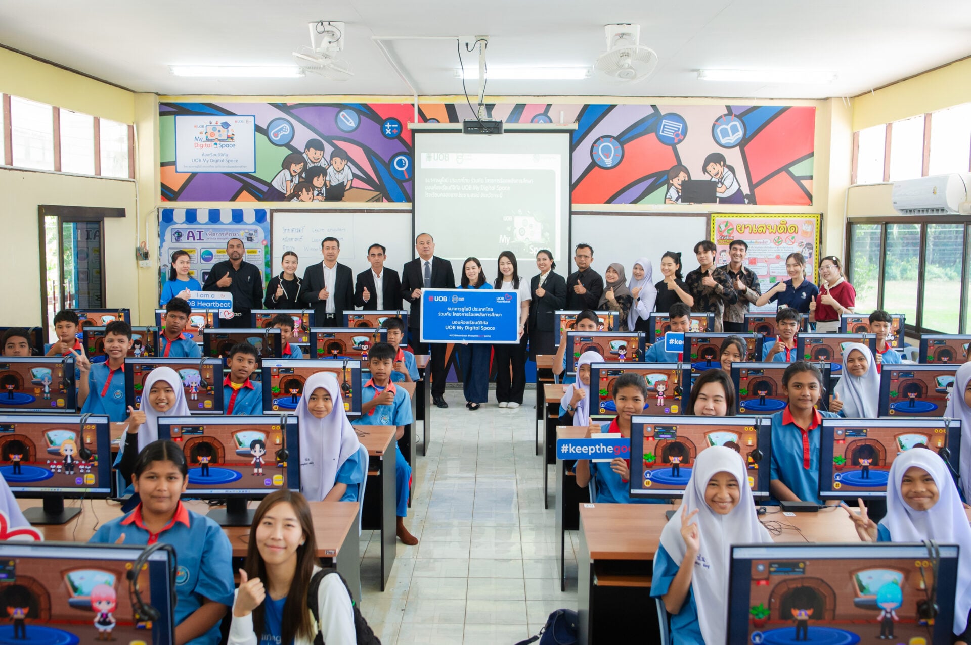 3โครงการที่UOB ให้การสรับสนุนได้แก่ 1.โครงการห้องเรียนดิจิทัล UOB My Digital Space (MDS) ทั้งนี้ รายงานปี 2568 จากกองทุนเพื่อความเสมอภาคทางการศึกษา (กสศ.) ระบุว่า โรงเรียนไทยโดยเฉลี่ยมีนักเรียนถึง 17 คนต่อคอมพิวเตอร์ 1 เครื่อง สะท้อนความแตกต่างด้านคุณภาพการเข้าถึงอุปกรณ์และโอกาสในการเรียนรู้เชิงที่ผ่านมาธธนาคารฯ ได้ร่วมมือกับโครงการร้อยพลังการศึกษา มูลนิธิยุวพัฒน์ ในการยกระดับโครงสร้างพื้นฐานดิจิทัลในพื้นที่ขาดโอกาส ควบคู่กับการพัฒนาทักษะ ด้านคณิตศาสตร์ วิทยาศาสตร์ และภาษาอังกฤษ พร้อมอบรมครูให้สามารถบูรณาการเทคโนโลยี เข้าสู่กระบวนการเรียนการสอนได้อย่างต่อเนื่อง นับเป็นการสร้างโอกาสให้การเรียนรู้เข้าถึงเด็กทุกคนอย่างเท่าเทียม โดยดำเนินโครงการมาเป็นเวลา 4ปี ใน10 โรงเรียนพื้นที่ห่างไกล 10 จังหวัดพบว่าครูและนักเรียน 5,504 คน สามารถยกระดับห้องเรียนดิจิทัลได้ มีการใช้งานหลักสูตรดิจิทัลใน3วิชา คือ วิชาวิทยาศาสตร์ คณิตศาสตร์ ภาษาอังกฤษ 10,045 คน เพิ่มศักยภาพครูผู้สอนได้ 144 คน สะท้อนการเปลี่ยนผ่านจากการเข้าถึงอุปกรณ์ สู่ความสามารถและความมั่นใจในการเรียนรู้ยุคดิจิทัล