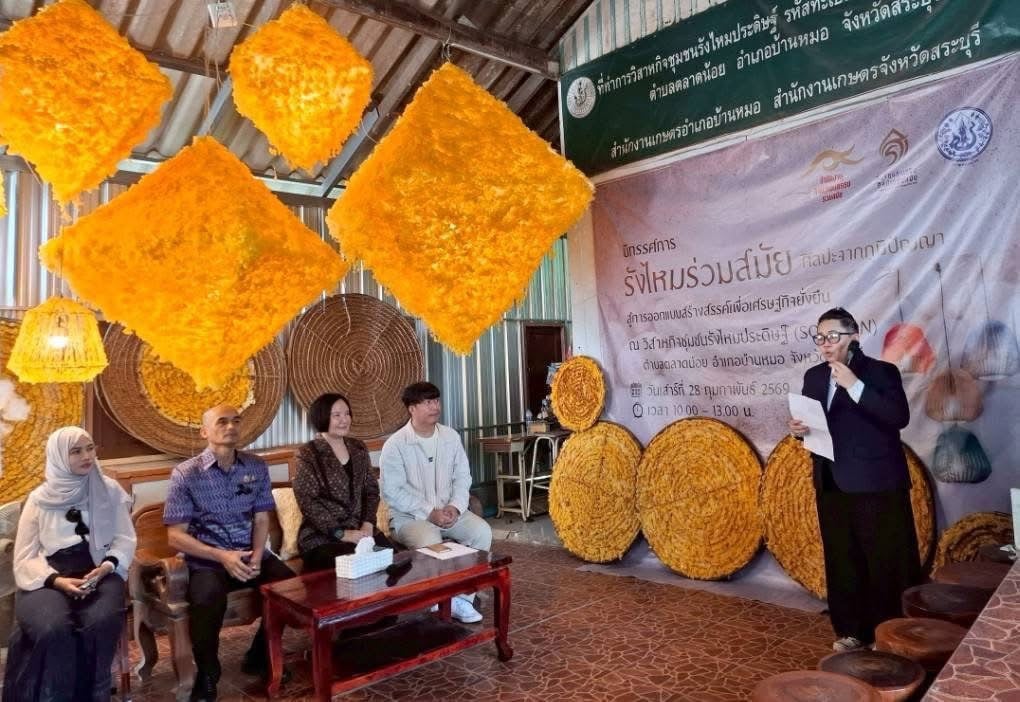 “รังไหมร่วมสมัย : ศิลปะจากภูมิปัญญาสู่การออกแบบสร้างสรรค์เพื่อเศรษฐกิจยั่งยืน” ดำเนินโครงการ โดยนายกิติศักดิ์ ขจรภัย รองประธานวิสาหกิจชุมชนรังไหมประดิษฐ์ เป็น 1 ใน 44 โครงการที่ได้รับการส่งเสริมจากกองทุนส่งเสริมศิลปะร่วมสมัย ประจำปีงบประมาณ พ.ศ. 2569 โครงการนี้นำทุนทางวัฒนธรรมและวัตถุดิบจากท้องถิ่นโดยนำงานศิลปหัตถกรรมจากรังไหมมาพัฒนาต่อยอดองค์ความรู้ เพิ่มมูลค่าผลิตภัณฑ์ สร้างรายได้ และยกระดับมาตรฐานการผลิตสู่ความยั่งยืน นำไปสู่ความเข้มแข็งของเศรษฐกิจฐานรากในระดับพื้นที่จังหวัดสระบุรี ผู้เข้าร่วมโครงการสามารถนำความรู้ไปประยุกต์ใช้จริง และเกิดผลลัพธ์ที่เป็นรูปธรรมต่อชุมชน สร้างอาชีพให้กับคนในชุมชนไม่น้อยกว่า 50 ครัวเรือน