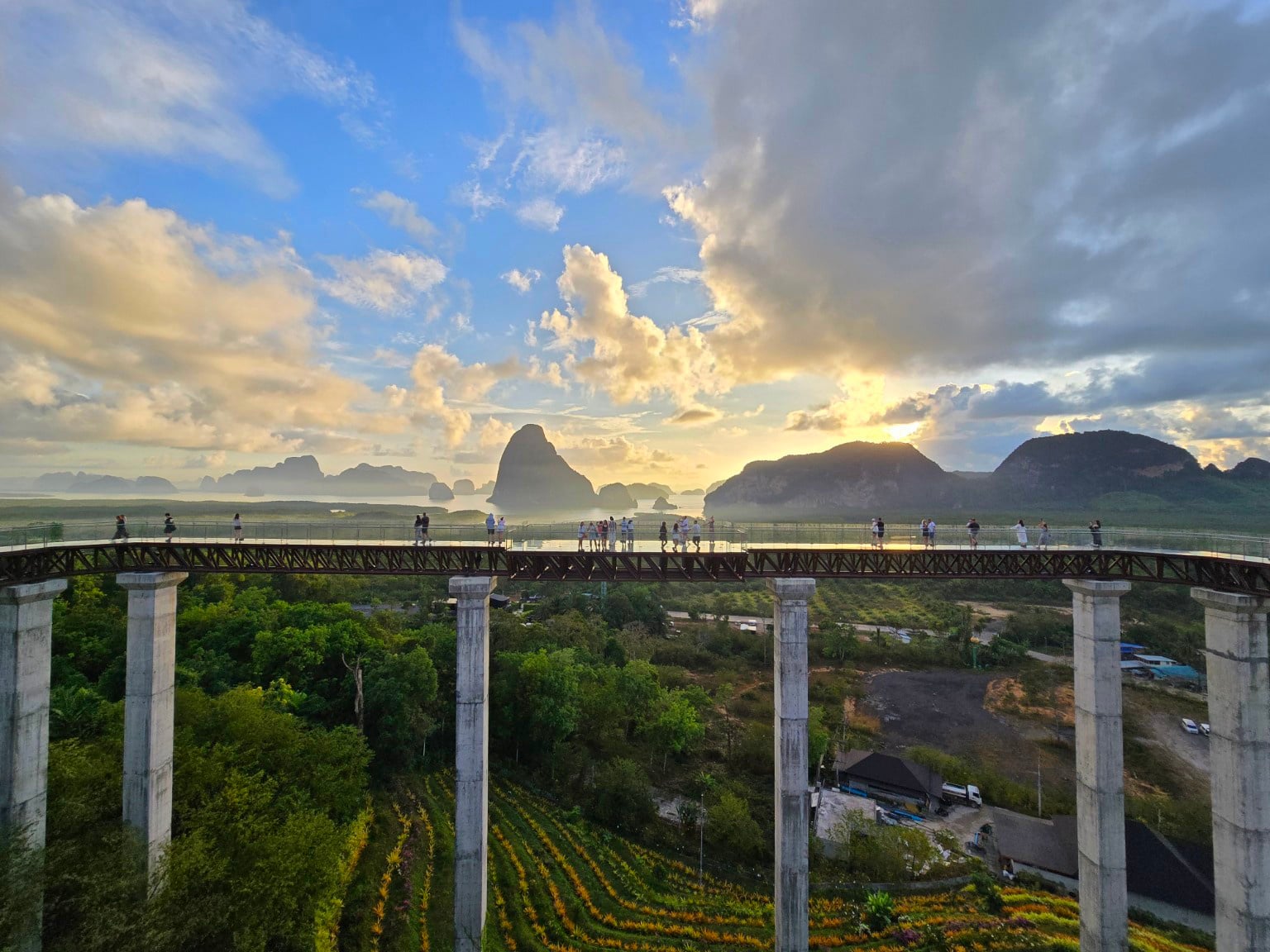 เราเลือกมาถึงตั้งแต่ฟ้ายังไม่สว่างเต็มที่ เดินขึ้นสู่บียอนด์ สกายวอล์ก สะพานกระจกยาว 180 เมตร สูงกว่า 80 เมตรเหนือระดับน้ำทะเล ก้าวแรกอาจมีใจเต้นเล็กน้อย สำหรับใครที่กลัวความสูง แต่เมื่อเงยหน้ามองออกไป ภาพตรงหน้าก็ทำให้ลืมความหวาดเสียว วิวพาโนรามา 360 องศาเผยให้เห็นแนวป่าชายเลนผืนใหญ่ ทะเลอันดามัน และหมู่เกาะหินปูนที่ตั้งตระหง่านกลางผืนน้ำ เรียงตัวสลับซ้อนเป็นชั้น ๆ สีเขียวของพืชพรรณตัดกับผืนน้ำสีฟ้าอ่อนในแสงเช้า งดงามจนต้องหยุดมองอยู่นาน