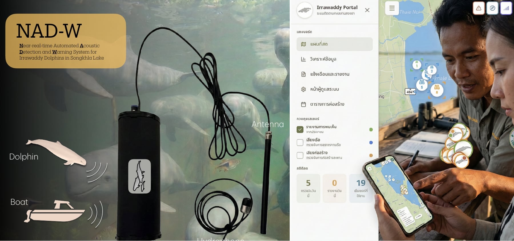 “การทำวิจัยเบื้องต้นเราต้องรู้จำนวนที่ชัดเจนก่อน เพื่อเป็นข้อมูลพื้นฐานการอนุรักษ์ ด้วยเหตุนี้ ทางโครงการจึงวางแผนจะติดตั้งเครื่องมืออะคูสติก 64 ตัว หรือ เรียกอีกอย่างว่า Hydrophone เพื่อให้ได้ข้อมูลจำนวนประชากร การแพร่กระจายประชากร เพศ อายุ การติดตามความเคลื่อนไหวของโลมาอิรวดีในแต่ละฤดู เครื่องมือนี้มีประสิทธิภาพมาก เราเป็นเจ้าแรกต้นๆ ของโลกที่ใช้ อย่าว่าแต่โลมาเลย แม้แต่กุ้งหอย ปูปลา เราก็จะรู้เสียงได้ทั้งหมด และเสียงนี้จะทำให้รู้ว่าโลมา เคลื่อนไหวไปในทิศทางไหน ข้อมูลที่ได้จะส่งยังโทรศัพท์มือถือ และรายงานเป็น Dashboard “สันติกล่าว