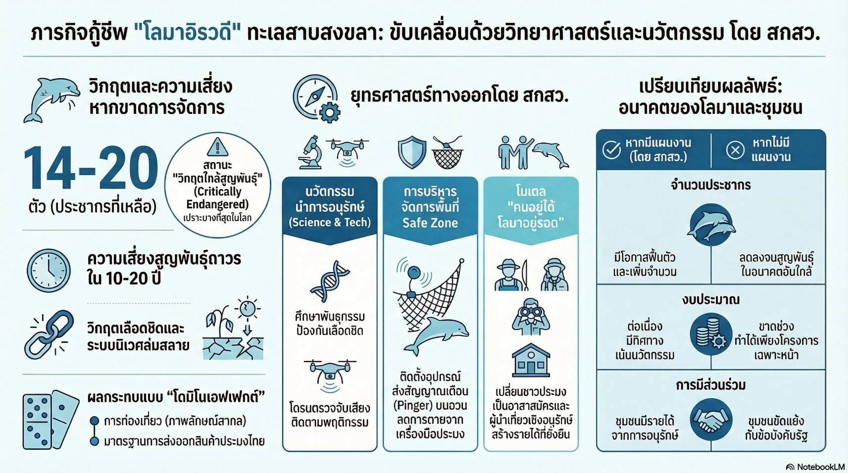 “กองทุน ววน. ได้สนับสนุนงบประมาณวิจัยรวม 89.3 ล้านบาท ภายใต้แผนงานแก้ปัญหาและตอบสนองภาวะวิกฤติเร่งด่วนของประเทศ ผ่าน สำนักงานการวิจัยแห่งชาติ หรือ วช. เพื่อศึกษาแนวทางการอนุรักษ์และฟื้นฟูทรัพยากรโลมาอิรวดีและระบบนิเวศทะเลสาบสงขลาอย่างยั่งยืน ผสานกับการบริหารจัดการด้านเศรษฐกิจและสังคมของชุมชนโดยรอบให้สอดคล้องและเกื้อหนุนต่อการคุ้มครองทรัพยากร โดยตั้งเป้าจะดำเนินการต่อเนื่องอย่างน้อย 3 ปี” ผอ. สกสว.กล่าว