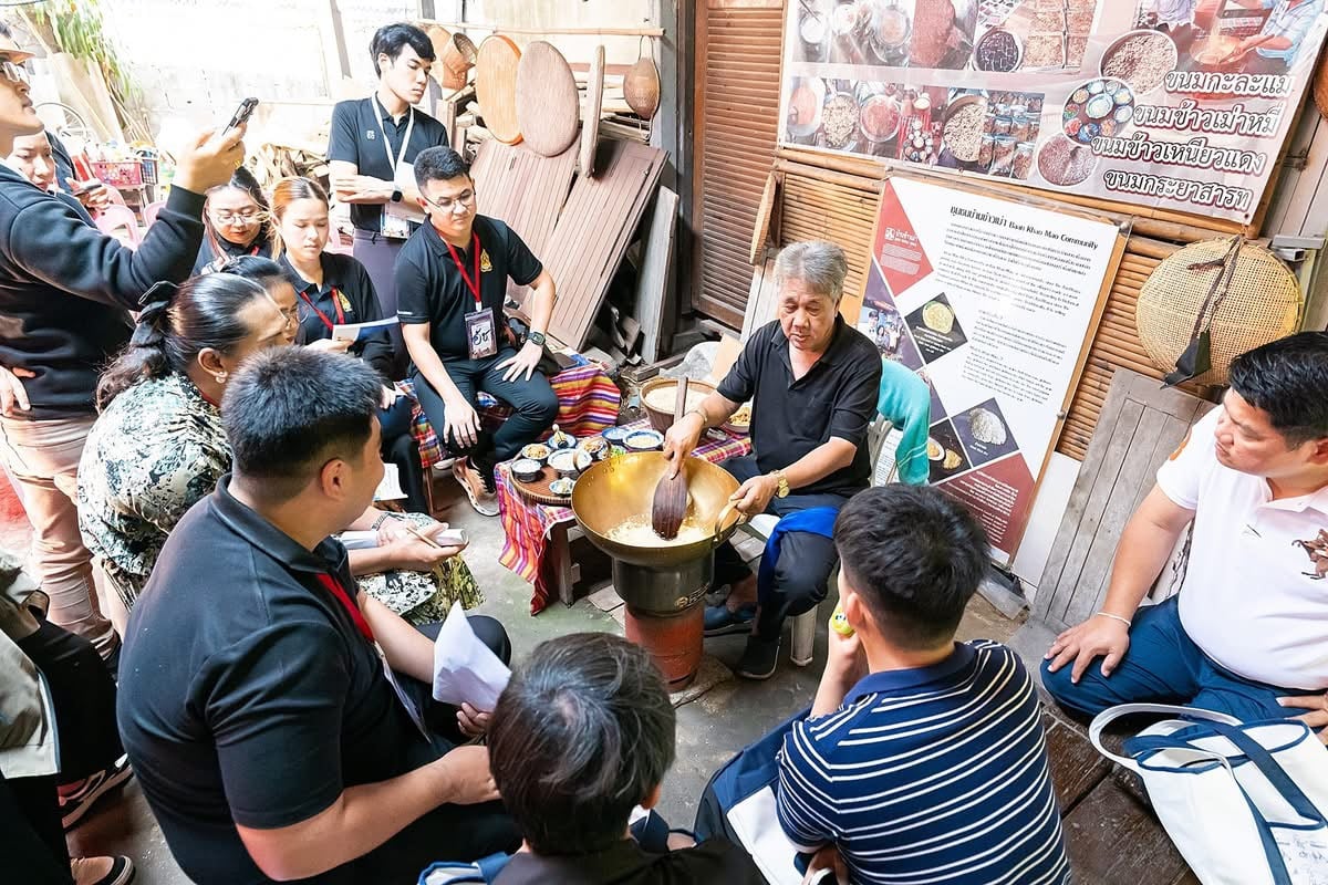 กิจกรรมลงพื้นที่ฝึกปฏิบัติ แบ่งเป็น 3 กลุ่ม จัดเก็บมรดกภูมิปัญญาในสาขาที่แตกต่างกัน เริ่มจากกลุ่มที่ 1 นำโดย รศ. ดร.อภิลักษณ์ เกษมผลกูล ศึกษากรณี “กระตั้วแทงเสือ” กลุ่มที่ 2 นำโดย ผศ.แสนประเสริฐ ปานเนียม ศึกษากรณี “ข้าวเม่าหมี่” กลุ่มที่ 3 นำโดย อาจารย์ ดร.กษิด์เดช เนื่องจำนงค์ ศึกษากรณี “ปักชุดโขน” วธจ. แต่ละกลุ่มสนุกสนานได้ฝึกทักษะการสัมภาษณ์ผู้รู้ การสังเกตการณ์ การบันทึกข้อมูล และตรวจสอบความถูกต้องของเนื้อหาในบริบทพื้นที่จริง พร้อมเรียนรู้มิติทางสังคม วัฒนธรรม และประวัติความเป็นมาขององค์ความรู้มรดกภูมิปัญญาทางวัฒนธรรมแต่ละรายการในพื้นที่กรุงเทพฯ