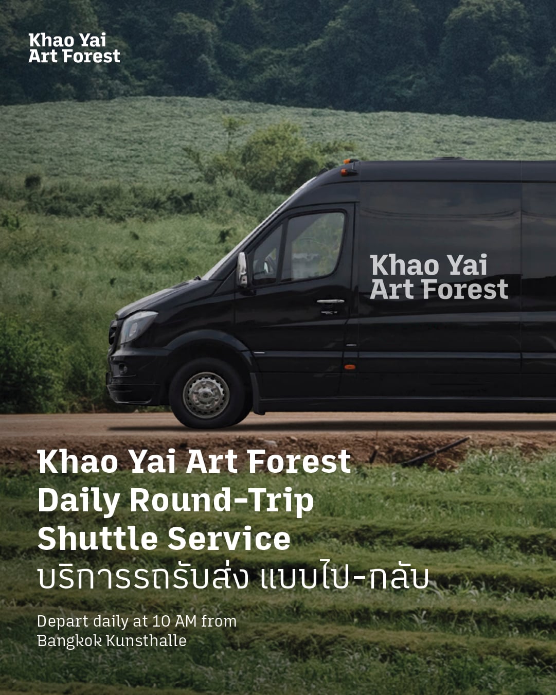 เขาใหญ่ อาร์ต ฟอเรสต์ พร้อมให้บริการรถรับ-ส่งแบบ One Day Trip จากกรุงเทพฯ (ณ Bangkok Kunsthalle) ทุกวันพฤหัสบดี–วันอาทิตย์ ราคา 500 บาท/ ท่าน (ไป-กลับ) ออกเดินทาง 10:00 น. และกลับ 17:00 น. (จองล่วงหน้าเนื่องจากที่นั่งมีจำกัด) ผ่านทาง Ticket Tailor หรือ Inbox Facebook: Khao Yai Art Forest