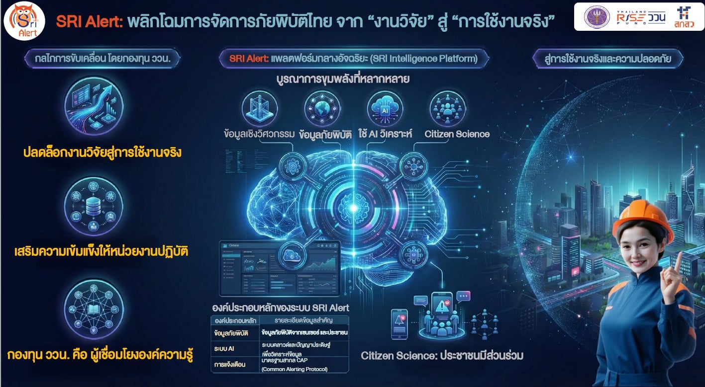 จากบทเรียนภัยพิบัตินำมาสู่การเปลี่ยนวิธีคิดจากการตอบสนองเมื่อเกิดเหตุเป็นการยกระดับจัดการภัยพิบัติจากการตัดสินใจเชิงรุกบนฐานข้อมูลวิทยาศาสตร์ วิจัย นวัตกรรม ร่วมกับประชาชน สำนักงานคณะกรรมการส่งเสริมวิทยาศาสตร์ วิจัยและนวัตกรรม (สกสว.) สนับสนุนการพัฒนาโครงการ SRI Alert (ศรีเตือนภัย) แพลตฟอร์มอัจฉริยะที่เชื่อมโยงข้อมูลจากทุกภาคส่วน เพื่อสนับสนุนการตัดสินใจด้านภัยพิบัติแบบ Realtime โดยการมีส่วนร่วมของภาคประชาชน โดย SRI Alert ทำหน้าที่เชื่อมโยงข้อมูลจากเซ็นเซอร์ จากหน่วยงานภาครัฐ และรายงานจากพื้นที่จริงโดยประชาชน ข้อมูลจากหลายแหล่งจะถูกวิเคราะห์โดยเทคโนโลยีปัญญาประดิษฐ์ (AI) เพื่อประมวลผลสถานการณ์แบบเรียลไทม์ และเชื่อมโยงกับมาตรการสากล CAP ส่งต่อยังผู้มีอำนาจตัดสินใจ สั่งการ เตือนได้ทันท่วงทีทั้งน้ำท่วม แผ่นดินไหว มลพิษ ความเสี่ยงดินถล่ม ช่วยรับมือเหตุฉุกเฉินและลดความสูญเสีย
