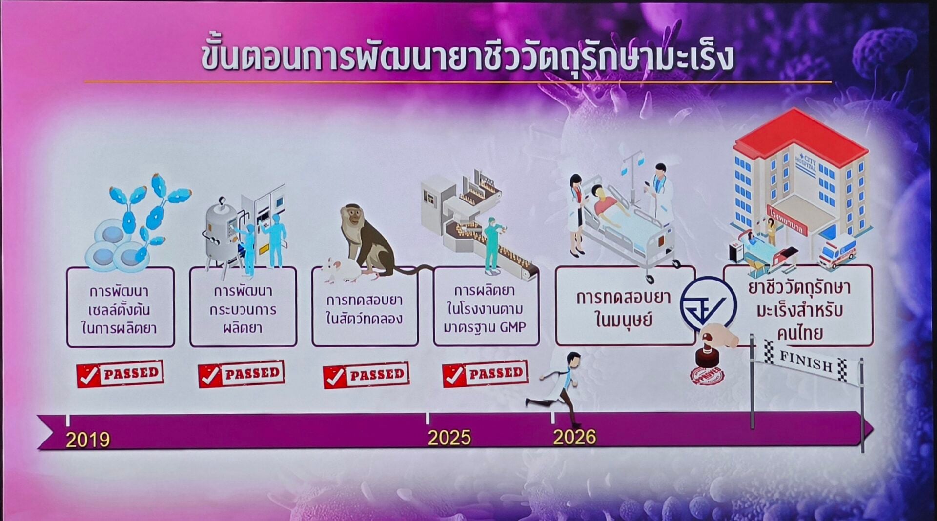 ความก้าวหน้าที่สำคัญในปัจจุบัน นพ.ไตรรักษ์ กล่าวว่า ทีมสามารถพัฒนาจนได้ผลิตภัณฑ์ยาชีววัตถุรักษามะเร็งใน ระดับมาตรฐาน GMP และดำเนินการในขั้นตอนการบรรจุเป็นผลิตภัณฑ์ยาสำเร็จรูป ด้วยความร่วมมือกับ สภากาชาดไทย ซึ่งถือเป็นก้าวสำคัญที่ทำให้โครงการสามารถเข้าสู่ระยะการวิจัยในมนุษย์ได้ จากผลการวิเคราะห์คุณภาพยาชีววัตถุรักษามะเร็งของเรา พบว่าอยู่ในเกณฑ์มาตรฐานที่กำหนดไว้ และขณะนี้อยู่ระหว่าง การทดสอบเพิ่มเติมเพื่อยืนยันความเทียบเท่ากับยาของต่างประเทศตามหลักวิชาการ ซึ่งถือเป็นอีกขั้นตอนสำคัญในการประเมินความปลอดภัยและประสิทธิภาพของผลิตภัณฑ์ เกิดขึ้นได้จากการสนับสนุนของประชาชนไทยที่ร่วมกันผลักดันและให้การสนับสนุนอย่างต่อเนื่อง การวิจัยในมนุษย์อย่างมีคุณภาพในระยะถัดไป