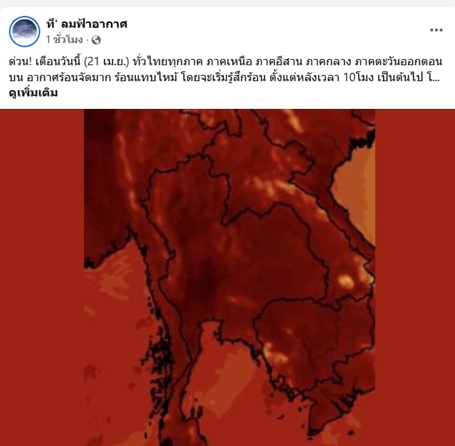 21 เมษายน2569-เพจ “ที ลมฟ้าอากาศ “ที่เฝ้าติดตามการเปลี่ยนแปลงสภาพอากาศ และเคยออกมาเตือนเมื่อเดือนพฤศจิกายน 2568 ว่าหาดใหญ่จะเจอน้ำท่วมหนัก ได้โพสต์ข้อความถึงสภาพาอากาศร้อนช่วงนี้ว่า ด่วน! เตือนวันนี้ (21 เม.ย.) ทั่วไทยทุกภาค ภาคเหนือ ภาคอีสาน ภาคกลาง ภาคตะวันออกตอนบน อากาศร้อนจัดมาก ร้อนแทบไหม้ โดยจะเริ่มรู้สึกร้อน ตั้งแต่หลังเวลา 10โมง เป็นต้นไป โดยช่วงบ่าย 2-3โมง อุณหภูมิอาจจะสูงทะลุ 42-44องศาฯ บางพื้นที่