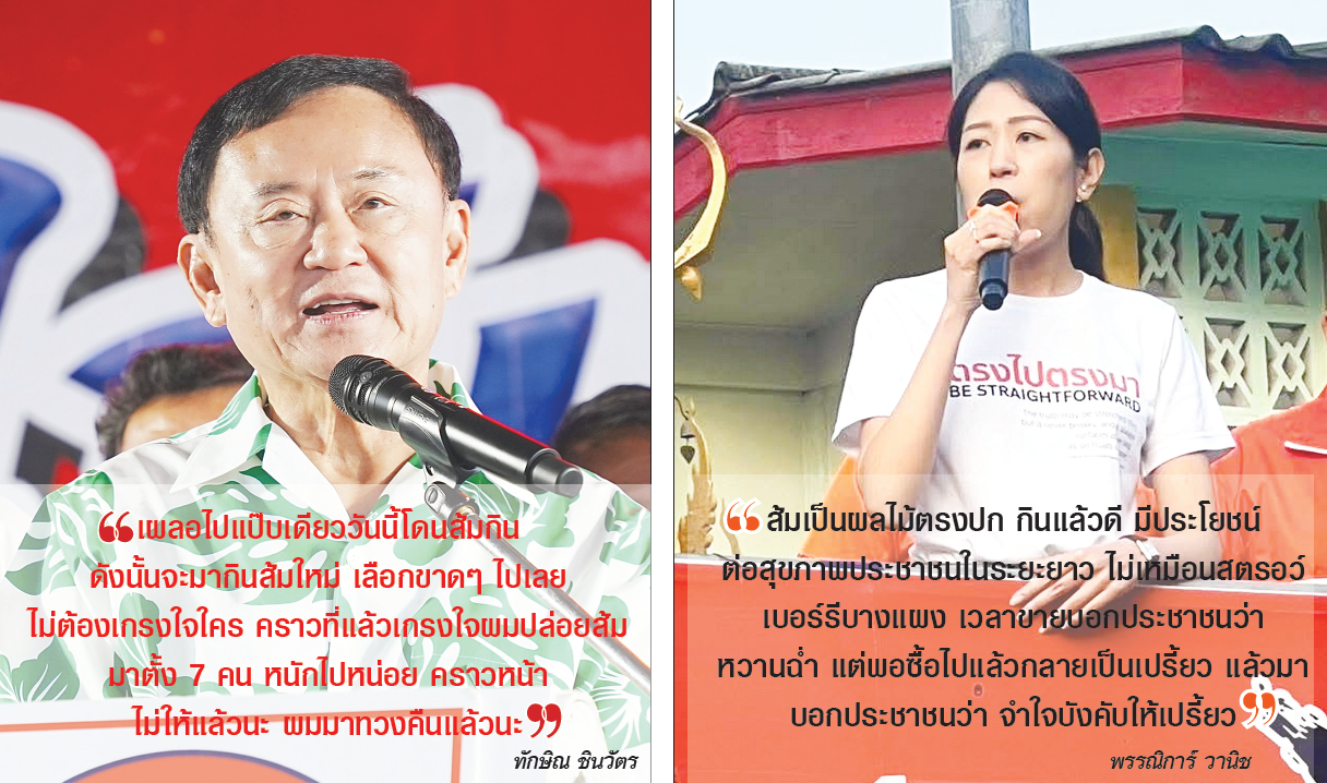 ถามถึงการปราศรัยบนเวทีที่บอกตรุษจีนต้องใส่เสื้อแดงกินส้ม ทำให้ น.ส.พรรณิการ์ วานิช โฆษกคณะก้าวหน้า ออกมาพูดว่า "ส้มมีประโยชน์ต่อสุขภาพประชาชน ไม่เหมือนสตรอว์เบอร์รีที่บอกหวานฉ่ำ แต่พอซื้อไปแล้วเปรี้ยว" นายทักษิณยิ้มก่อนกล่าวว่า เป็นกิมมิกทางการเมือง อย่าซีเรียสกับมัน