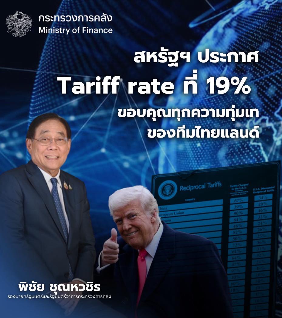 สหรัฐเคาะภาษีไทยเหลือ 19% “พิชัย” ระบุ เริ่มเก็บทางการ 7 ส.ค. ครอบคลุมสินค้าหลายประเภท ส่วนภาษีมะกันส่งมาไทยเหลือ 0% เพียบ ด้าน “ครม.” ไฟเขียวร่างถ้อยแถลงเตรียมส่งสภา “ศิริกัญญา” จี้เปิดรายละเอียดสินค้า