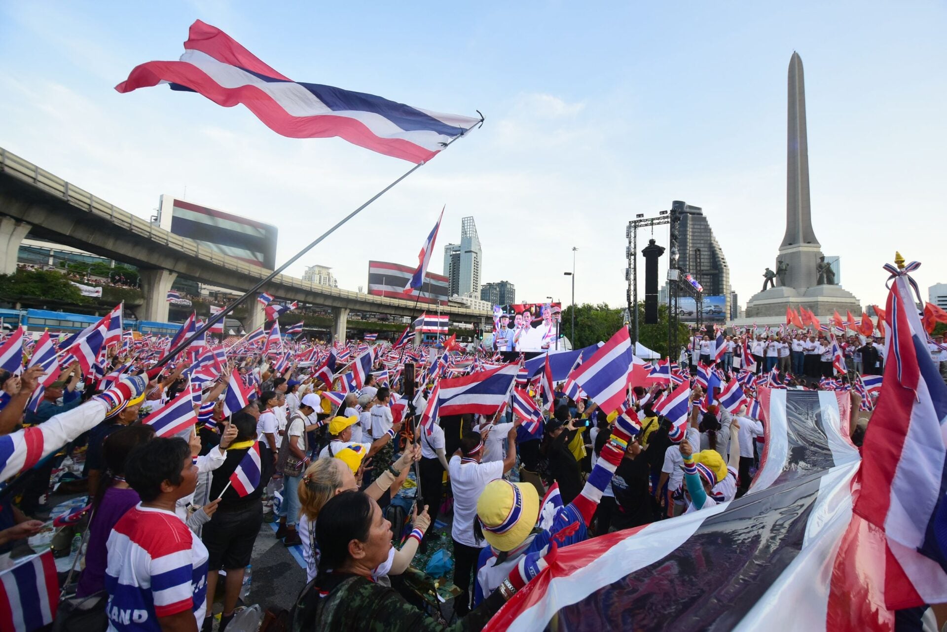 โดยเริ่มมีประชาชนบางส่วนทยอยเข้าจับจองพื้นที่ พร้อมชูธงชาติบริเวณถนนหน้าอนุสาวรีย์ชัยสมรภูมิและสกายวอล์ก เพื่อเป็นการแสดงออกเชิงสัญลักษณ์ ท่ามกลางอากาศที่ร้อนจัด ขณะที่เจ้าหน้าที่ตำรวจเตรียมกำลังรักษาความปลอดภัยไว้โดยรอบพื้นที่จัดงาน 2,000 นาย