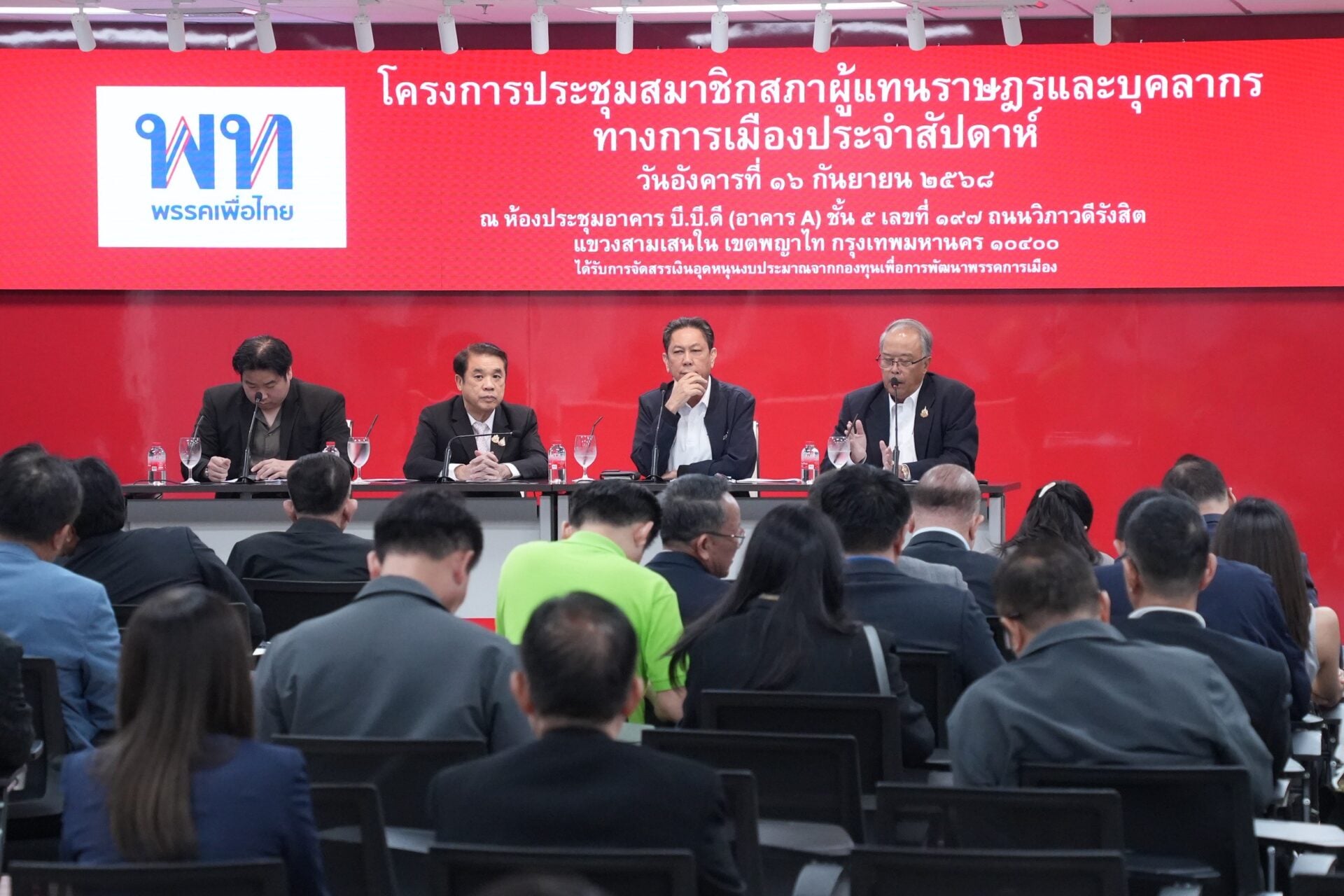 ที่่พรรคเพื่อไทย เมื่อเวลา 15.00 น. ผู้สื่อข่าวรายงานว่า ในการประชุมพรรคเพื่อไทยประจำสัปดาห์ นายชูศักดิ์ ศิรินิล รองหัวหน้าพรรค และนายสุริยะ จึงรุ่งเรืองกิจ แกนนำพรรค เป็นประธานการประชุม เมื่อ น.ส.แพทองธาร ชินวัตร หัวหน้าพรรคเดินเข้าห้องประชุม สมาชิกพรรคได้ปรบมือให้กำลังใจ ก่อนที่ น.ส.แพทองธารจะเดินไปนั่งกับแกนนำพรรค