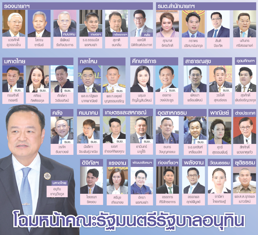 โปรดเกล้าฯ แต่งตั้ง "ครม.อนุทิน" 36 คน 40 ตำแหน่ง ตามโผ "โสภณ-ธรรมนัส" รองนายกฯ "วรภัค" รมช.คลัง พร้อม รมต.สำนักนายกฯ 4 คน เผย "นายกฯ" เตรียมนำ ครม.ใหม่ถวายสัตย์ปฏิญาณฯ 24 ก.ย.นี้ ก่อนออกมาประชุม ครม.นัดพิเศษทันที ยังไม่ชัดวันแถลงนโยบายต่อรัฐสภาคาด 29-30 ก.ย. "โฆษก ภท." ชี้ไม่น่าทัน 25 ก.ย. เหตุบรรจุวาระต้องแจ้งล่วงหน้า 5 วัน "อนุทิน" โชว์ภาพนั่งทานอาหารร่วมกับ "อภิสิทธิ์" บอกคุยหลายเรื่อง ยกคำแนะนำมีคุณค่า ลั่นร่างนโยบายรัฐบาลพร้อมแล้ว 99% "พท.-ปชน." เริ่มทำหน้าที่ฝ่ายค้าน "ภูมิธรรม" โยนถามพรรคเด็กเห็นโฉมหน้า ครม.คิดอย่างไร แซะล้วนบุรีรัมย์โมเดลทั้งหมด "จิรายุ" บี้ สลค.เปิดเอกสารกรอกประวัติ รมต.ตรวจสอบ "พริษฐ์” วาง 4 ประเด็นชำแหละในเวทีสภา