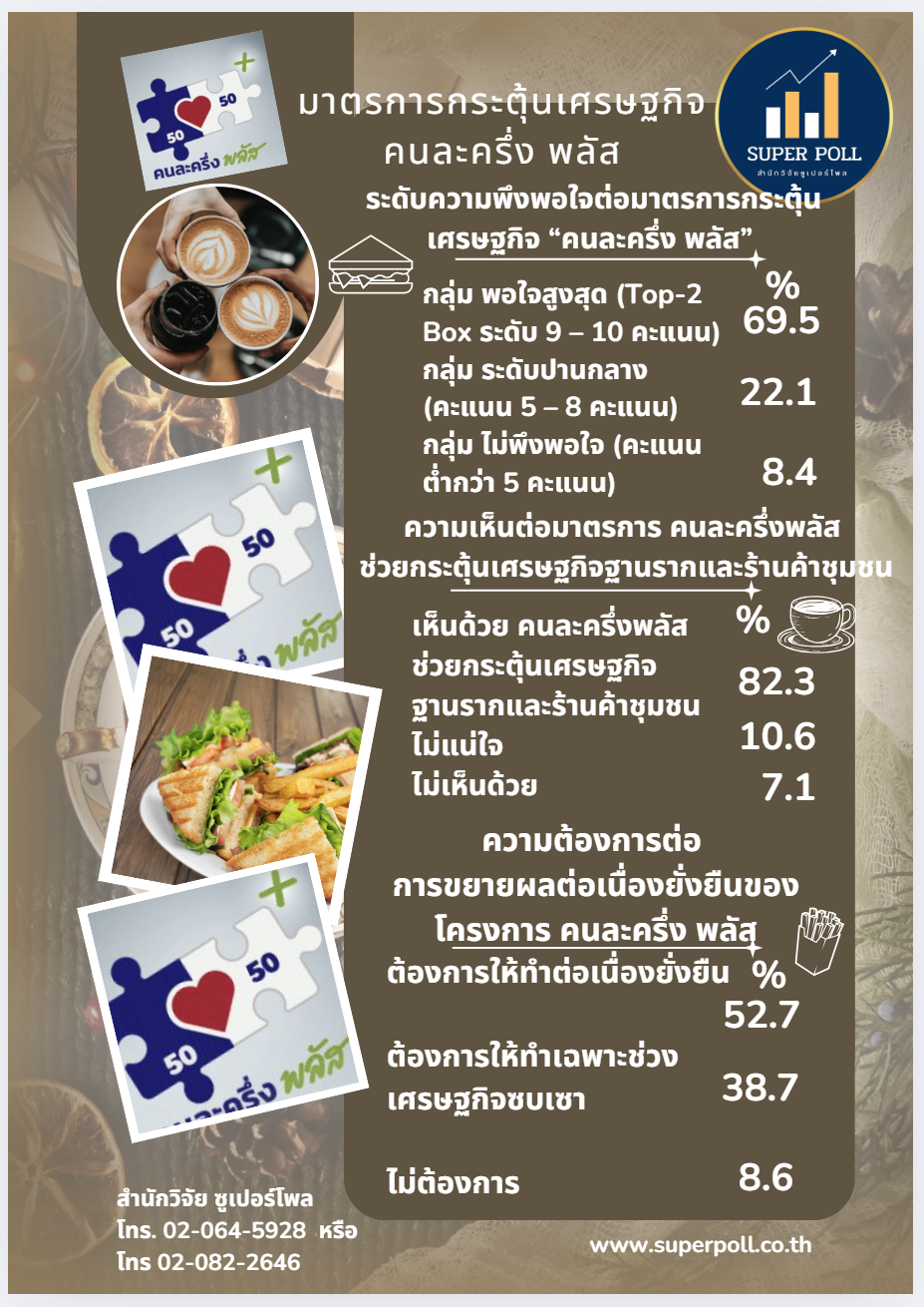 เมื่อวันอาทิตย์ที่ 2 พ.ย.2568 สำนักวิจัยซูเปอร์โพลเปิดเผยรายงานผลการสำรวจเรื่อง มาตรการกระตุ้นเศรษฐกิจคนละครึ่งพลัส จากกลุ่มตัวอย่างประชาชนทุกสาขาอาชีพทั่วประเทศ 1,248 ตัวอย่าง โดยพบว่าประชาชนส่วนใหญ่ 69.5% อยู่ในกลุ่มพอใจสูงสุด สะท้อนถึงความรู้สึกเชิงบวกต่อมาตรการดังกล่าว ขณะที่ประชาชน 22.1% แสดงความพึงพอใจในระดับปานกลาง และมีเพียง 8.4% เท่านั้นที่ไม่พึงพอใจ