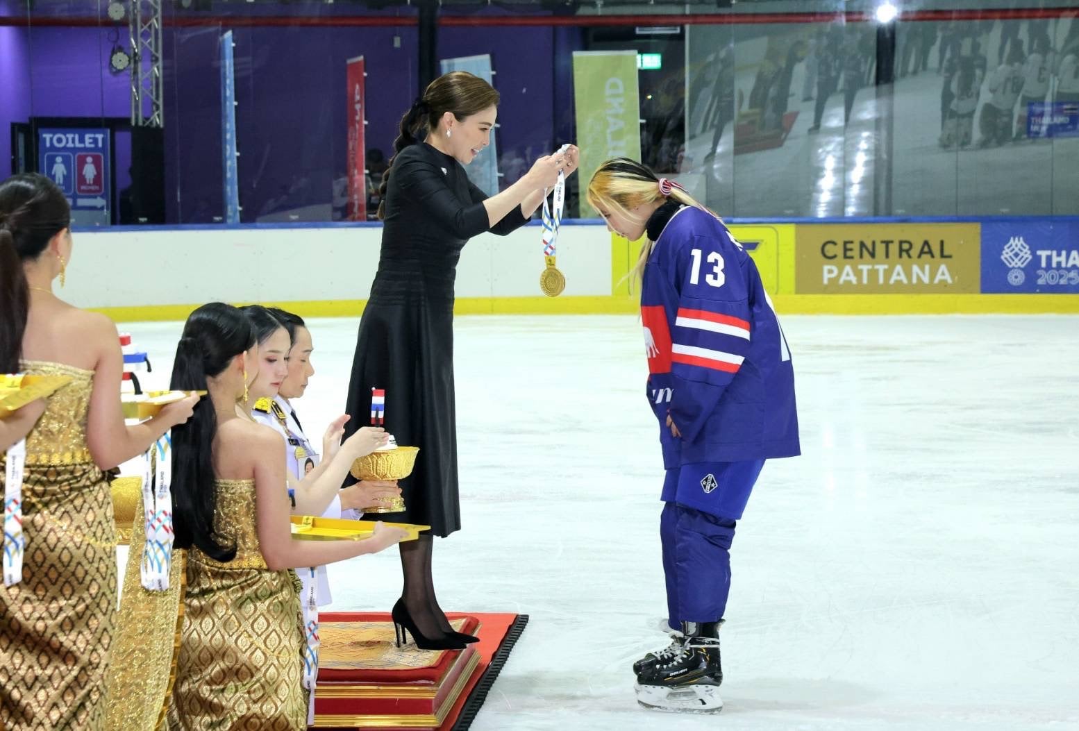 พระราชินีพระราชทานเหรียญทองนักกีฬาฮอกกี้น้ำแข็งหญิงทีมชาติไทย ในมหกรรมซีเกมส์ ครั้งที่ 33