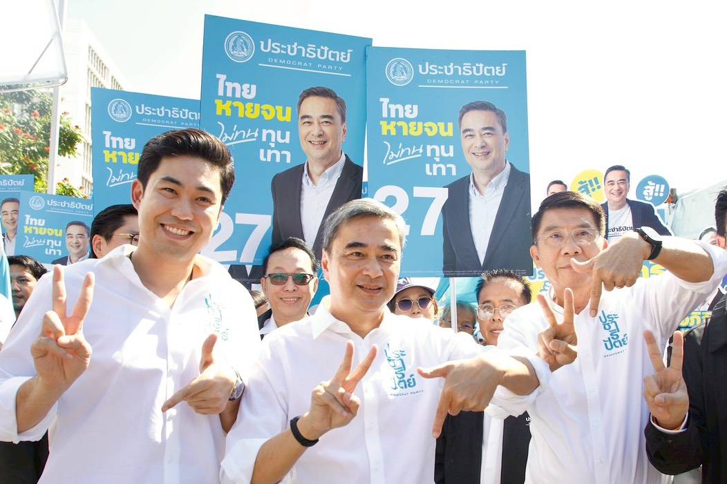 นายอภิสิทธิ์ เวชชาชีวะ หัวหน้าพรรคประชาธิปัตย์ พร้อมด้วยนายกรณ์ จาติกวณิช ดร.การดี เลียวไพโรจน์ 3 แคนดิเดตนายกรัฐมนตรีของพรรคประชาธิปัตย์ เบอร์ 27 และนางสาวศิริภา อินทวิเชียร ผู้สมัคร สส.เขต 6 พญาไท ดินแดง เบอร์ 5 ลงพื้นที่พบปะพี่น้องประชาชนตลาดนัดหลังกระทรวงการคลัง
