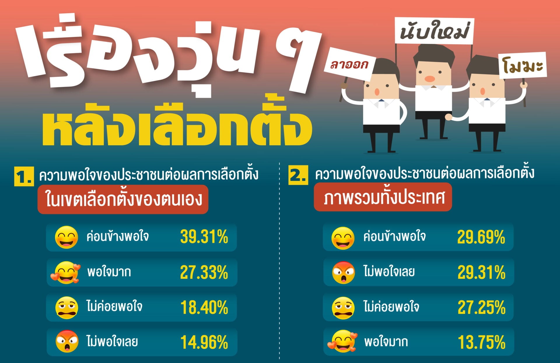 โพลตอกย้ำคนส่วนใหญ่พอใจผลการเลือกตั้ง นิด้าโพลเผยยุคสื่อออนไลน์ชี้นำสังคม ดุสิตโพลบอกผลเลือกตั้งได้คะแนนเกินครึ่ง แต่คนไทยยังติดใจเรื่องความไม่โปร่งใสและทุจริต