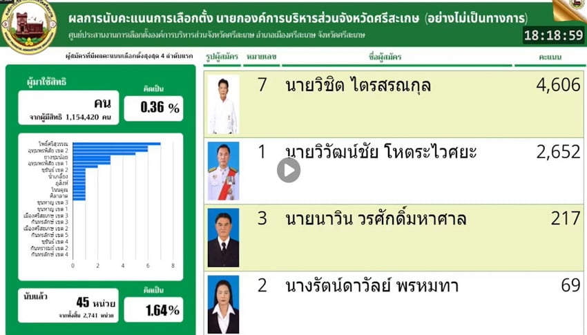 โดยผลการนับคะแนนล่าสุด ณ เวลา 18.18 น. ปรากฏว่า หมายเลข 7 นายวิชิต ไตรสรณกุล มีคะแนนนำเป็นอันดับ 1 ด้วยคะแนน 4,606 คะแนน