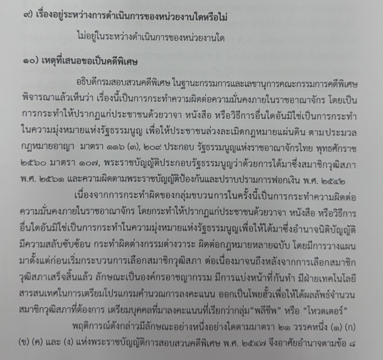 โดยเหตุที่อธิบดีกรมสอบสวนคดีพิเศษเสนอขอเป็นคดีพิเศษ พบว่า เรื่องนี้เป็นการกระทำความผิดต่อความมั่นคงภายในราชอาณาจักร โดยเป็นการกระทำให้ปรากฏแก่ประชาชนด้วยวาจา หนังสือ หรือวิธีการอื่นใดอันมิใช่เป็นการกระทำในความมุ่งหมายแห่งรัฐธรรมนูญเพื่อให้ประชาชนล่วงละเมิดกฎหมายแผ่นดิน ตามประมวลกฎหมายอาญา มาตรา 116 (3), 209 ประกอบรัฐธรรมนูญแห่งราชอาณาจักรไทย พุทธศักราช 2560 มาตรา 107, พระราชบัญญัติประกอบรัฐธรรมนูญว่าด้วยการได้มาซึ่งสมาชิกวุฒิสภาพ.ศ.2561 และความผิดตามพระราชบัญญัติป้องกันและปราบปรามการฟอกเงิน พ.ศ.2542