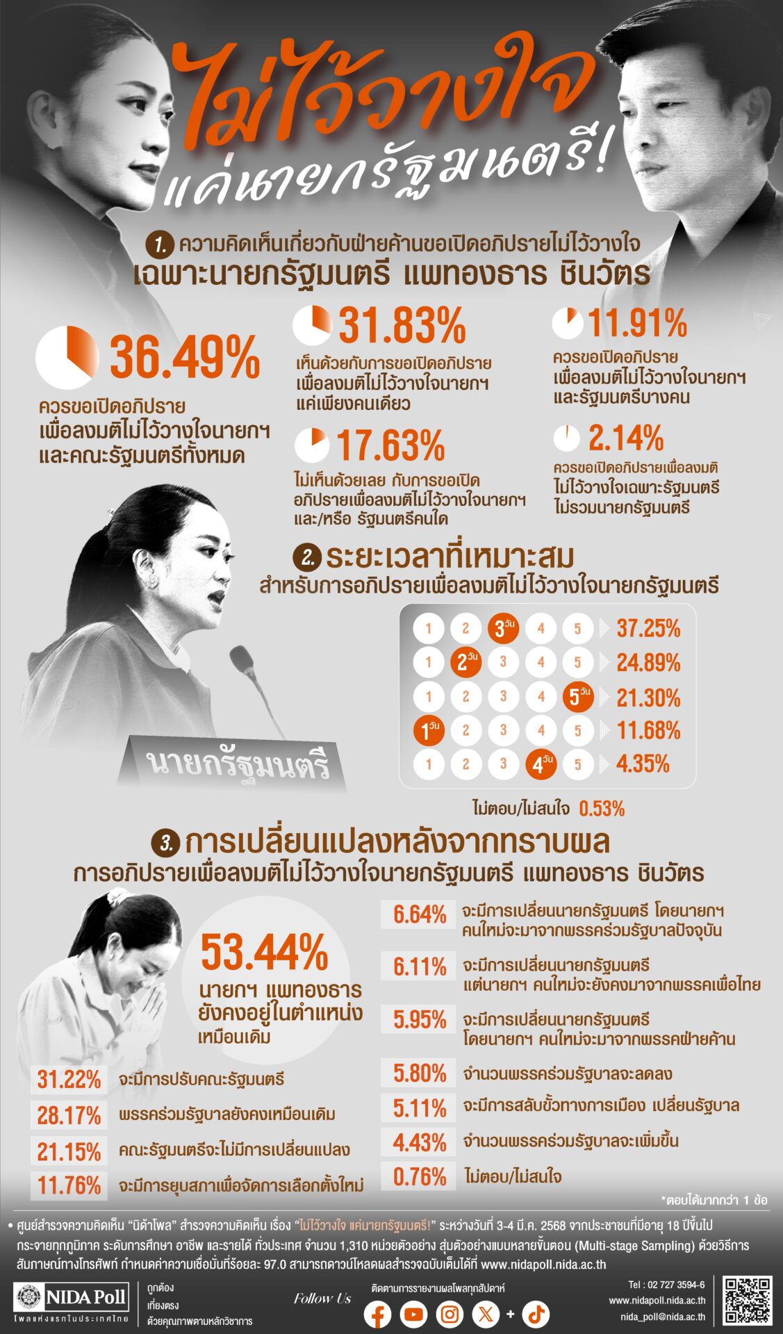 9 มี.ค. 2568 – ศูนย์สำรวจความคิดเห็น “นิด้าโพล” สถาบันบัณฑิตพัฒนบริหารศาสตร์ (นิด้า) เปิดเผยผลการสำรวจเรื่อง “ไม่ไว้วางใจ แค่นายกรัฐมนตรี !” ทำการสำรวจระหว่างวันที่ 3-4 มีนาคม 2568 จากประชาชนที่มีอายุ 18 ปีขึ้นไป กระจายทุกภูมิภาค ระดับการศึกษา อาชีพ และรายได้ ทั่วประเทศ รวมจำนวนทั้งสิ้น 1,310 หน่วยตัวอย่าง เกี่ยวกับการเปิดอภิปรายไม่ไว้วางใจเฉพาะนายกรัฐมนตรี แพทองธาร ชินวัตร การสำรวจอาศัยการสุ่มตัวอย่างโดยใช้ความน่าจะเป็นจากบัญชีรายชื่อฐานข้อมูลตัวอย่างหลัก (Master Sample) ของ “นิด้าโพล” สุ่มตัวอย่างแบบหลายขั้นตอน (Multi-stage Sampling) เก็บข้อมูลด้วยวิธีการสัมภาษณ์ทางโทรศัพท์ โดยกำหนดค่าความเชื่อมั่น ร้อยละ 97.0
