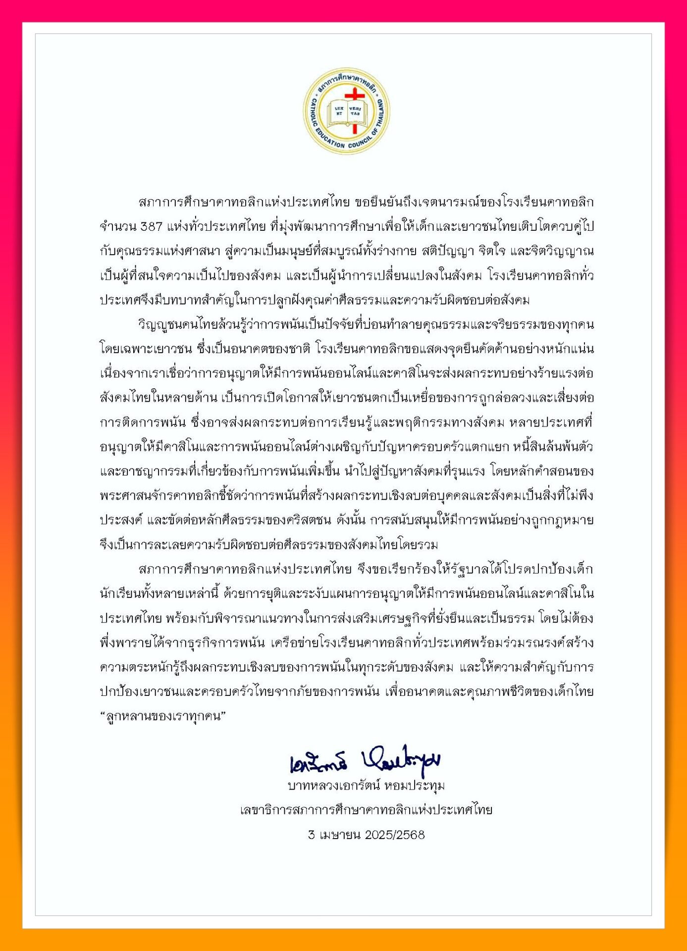 วิญญูชนคนไทยล้วนรู้ว่าการพนันเป็นปัจจัยที่บ่อนทำลายคุณธรรมและจริยธรรมของทุกคน โดยเฉพาะเยาวชน ซึ่งเป็นอนาคตของชาติ โรงเรียนคาทอลิกขอแสดงจุดยืนคัดค้านอย่างหนักแน่น เนื่องจากเราเชื่อว่าการอนุญาตให้มีการพนันออนไลน์และกาสิโนจะส่งผลกระทบอย่างร้ายแรงต่อสังคมไทยในหลายด้าน เป็นการเปิดโอกาสให้เยาวชนตกเป็นเหยื่อของการถูกล่อลวงและเสี่ยงต่อการติดการพนัน ซึ่งอาจส่งผลกระทบต่อการเรียนรู้และพฤติกรรมทางสังคม หลายประเทศที่อนุญาตให้มีกาสิโนและการพนันออนไลน์ต่างเผชิญกับปัญหาครอบครัวแตกแยก หนี้สินล้นพ้นตัว และอาชญากรรมที่เกี่ยวข้องกับการพนันเพิ่มขึ้น นำไปสู่ปัญหาสังคมที่รุนแรง โดยหลักคำสอนของพระศาสนจักรคาทอลิกชี้ชัดว่าการพนันที่สร้างผลกระทบเชิงลบต่อบุคคลและสังคมเป็นสิ่งที่ไม่พึงประสงค์ และขัดต่อหลักศีลธรรมของคริสตชน ดังนั้น การสนับสนุนให้มีการพนันอย่างถูกกฎหมายจึงเป็นการละเลยความรับผิดชอบต่อศีลธรรมของสังคมไทยโดยรวม