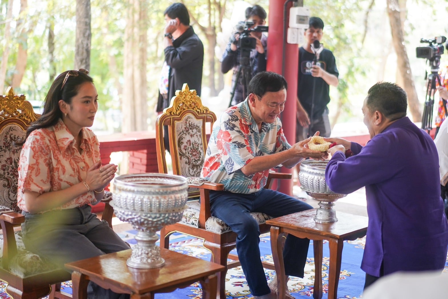 ก่อนที่นายทักษิณ จะเปิดโอกาสให้คณะทำงาน ข้าราชการในพื้นที่ รวมถึงสื่อมวลชน ได้รดน้ำดำหัวเนื่องในเทศกาลสงกรานต์ โดยมี น.ส.แพทองธาร นั่งอยู่ด้านข้าง