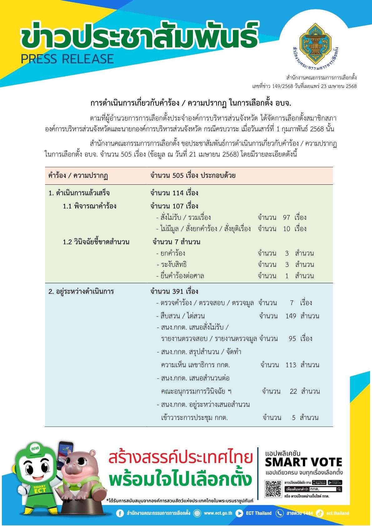 กกต. สรุปคำร้องเลือกตั้ง อบจ. มี 505 เรื่อง ลุ้น 5 เรื่องเสนอเข้าสู่วาระ กกต.ให้ชี้ขาด