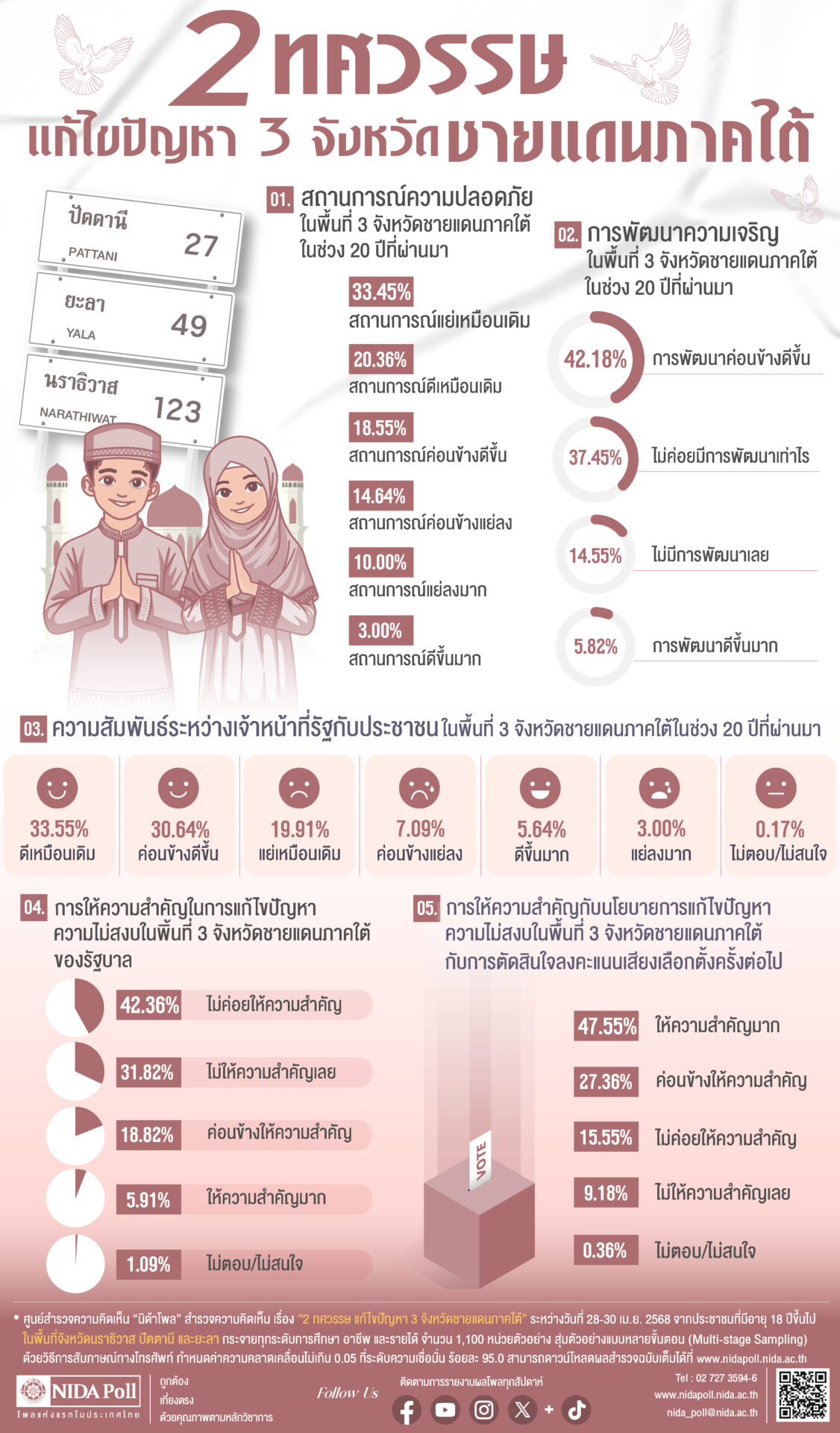 4 พ.ค. 2568 ศูนย์สำรวจความคิดเห็น “นิด้าโพล” สถาบันบัณฑิตพัฒนบริหารศาสตร์ (นิด้า) เปิดเผยผลการสำรวจเรื่อง “2 ทศวรรษ แก้ไขปัญหาสามจังหวัดชายแดนภาคใต้” ทำการสำรวจระหว่างวันที่ 28-30 เมษายน 2568 จากประชาชนที่มีอายุ 18 ปีขึ้นไป ในพื้นที่จังหวัดนราธิวาส ปัตตานี และยะลา กระจายทุกระดับการศึกษา อาชีพ และรายได้ รวมจำนวนทั้งสิ้น 1,100 หน่วยตัวอย่าง เกี่ยวกับสถานการณ์ความปลอดภัยในพื้นที่สามจังหวัดชายแดนภาคใต้ การสำรวจอาศัยการสุ่มตัวอย่างโดยใช้ความน่าจะเป็นจากบัญชีรายชื่อฐานข้อมูลตัวอย่างหลัก (Master Sample) ของ “นิด้าโพล” สุ่มตัวอย่างแบบหลายขั้นตอน (Multi-stage Sampling) เก็บข้อมูลด้วยวิธีการสัมภาษณ์ทางโทรศัพท์ โดยกำหนดค่าความคลาดเคลื่อนไม่เกิน 0.05 ที่ระดับความเชื่อมั่น ร้อยละ 95.0