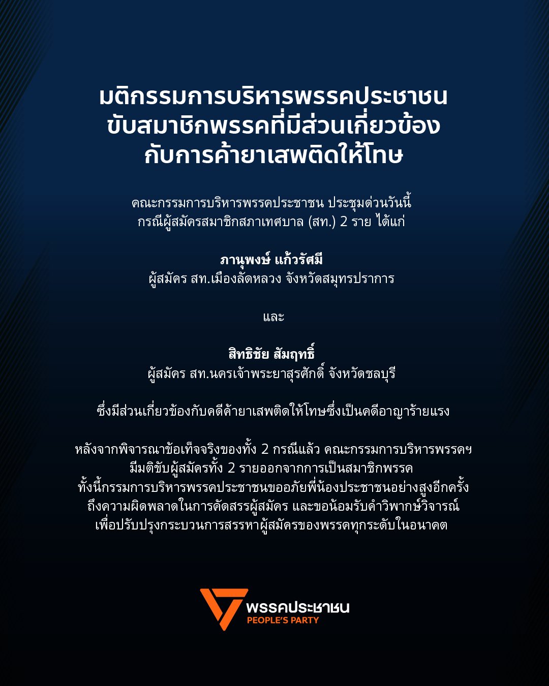 8 พฤษภาคม 2568 - พรรคประชาชน เปิดเผยมติกรรมการบริหารพรรค ประชุมด่วนวันนี้ กรณีผู้สมัครสภาเทศบาล (สท.) 2 ราย ได้แก่ นายภานุพงษ์ แก้วรัศมี ผู้สมัครสมาชิกสภาเทศบาลเมืองลัดหลวง จังหวัดสมุทรปราการ และนายสิทธิชัย สัมฤทธิ์ ผู้สมัครสมาชิกสภาเทศบาลนครเจ้าพระยาสุรศักดิ์ จังหวัดชลบุรี ซึ่งมีส่วนเกี่ยวข้องกับคดีค้ายาเสพติดให้โทษ ซึ่งเป็นคดีอาญาร้ายแรง หลังจากพิจารณาข้อเท็จจริงทั้งสองกรณีแล้ว คณะกก.บห.พรรคประชาชน มีมติขับผู้สมัคร สท.ทั้งสองรายออกจากการเป็นสมาชิกพรรค
