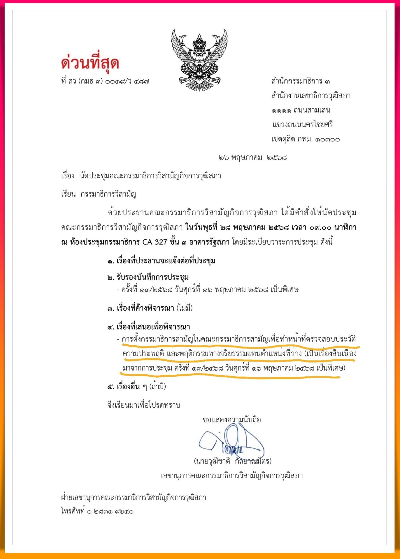 28 พ.ค.2568 - นพ.เปรมศักดิ์ เพียยุระ สมาชิกวุฒิสภา(สว.) ให้สัมภาษณ์ว่า มีหนังสือด่วนที่สุดออกเมื่อวันที่ 26 พ.ค.ส่งจากนายวุฒิชาติ กัลยาณมิตร เลขานุการคณะกรรมาธิการวิสามัญกิจการวุมิสภา (วิปวุฒิ) ถึงกรรมาธิการวิสามัญฯทุกคน เรียกประชุมด่วนในวันนี้ 28 พ.ค.เวลา 09.00 น.ที่อาคารรัฐสภา ซึ่งมีวาระเรื่องที่เสนอพิจารณาคือ การตั้งกรรมาธิการสามัญในคณะกรรมาธิการสามัญเพื่อทำหน้าที่ตรวจสอบประวัติ ความประพฤติ และพฤติกรรมทางจริยธรรมของบุคคลผู้ได้รับการเสนอชื่อให้ดำรงตำแหน่งกรรมการการเลือกตั้งและตุลาการศาลรัฐธรรมนูญ