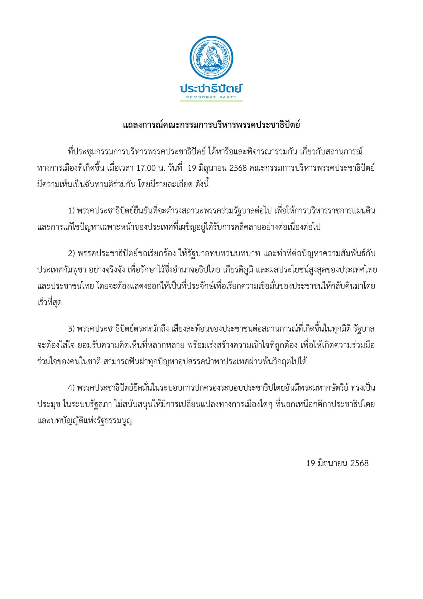 ที่ประชุมกรรมการบริหารพรรคประชาธิปัตย์ ได้หารือและพิจารณาร่วมกัน เกี่ยวกับสถานการณ์ทางการเมืองที่เกิดขึ้น เมื่อเวลา 17.00 น. วันที่ 19 มิถุนายน 2568 คณะกรรมการบริหารพรรคประชาธิปัตย์ มีความเห็นเป็นฉันทามติร่วมกัน โดยมีรายละเอียด ดังนี้