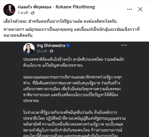 22 มิ.ย.2568- นายก่อแก้ว พิกุลทอง สส.บัญชีรายชื่อ พรรคเพื่อไทย โพสต์เฟซบุ๊กแชร์ทวิตของน.ส.แพทองธาร ชินวัตร นายกรัฐมนตรี ที่โพสต์ข้อความพร้อมภาพการหารือกับแกนนำพรรคร่วมรัฐบาลในการปรับครม. โดยระบุว่า เสียใจด้วยนะ สำหรับคนที่อยากให้รัฐบาลล้ม คงต้องผิดหวังครับ