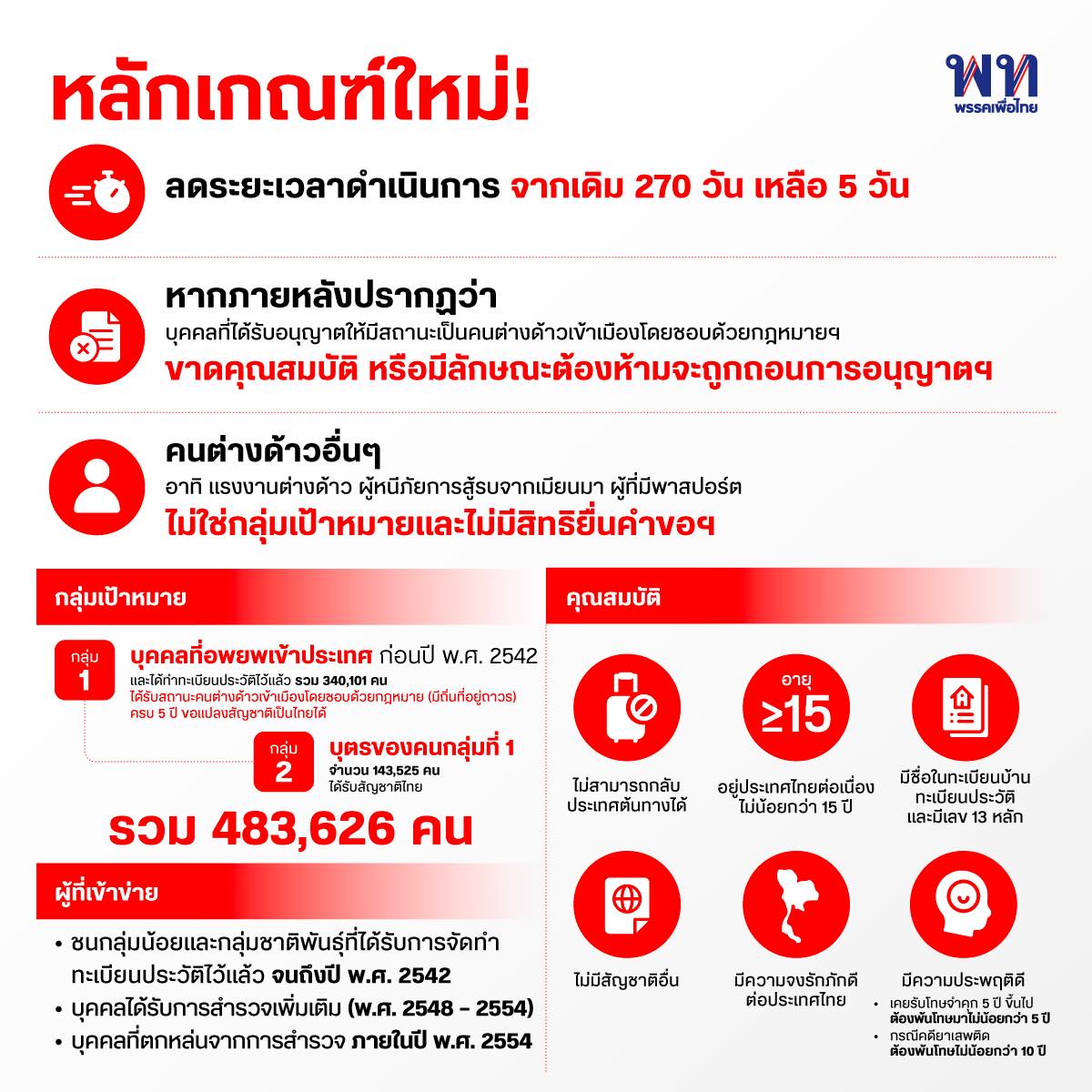 29 มิ.ย. 2568 – เพจพรรคเพื่อไทย โพสต์การผลักดันนโยบายการให้สัญชาติไทย กับ ต่างด้าว โดยปรับแก้หลักเกณฑ์การให้สถานะคนต่างด้าวเข้าเมืองโดยชอบด้วยกฎหมาย ตามมติครม.วันที่ 29 ตุลาคม 2567 มุ่งแก้ไขปัญหาสัญชาติและให้สถานะบุคคลไร้รัฐ