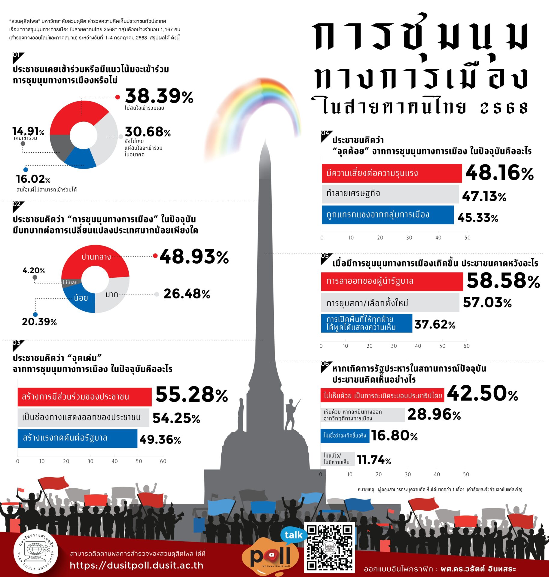 6 ก.ค. 2568 – “สวนดุสิตโพล” มหาวิทยาลัยสวนดุสิต สำรวจความคิดเห็นประชาชนทั่วประเทศ เรื่อง “การชุมนุมทางการเมืองในสายตาคนไทย 2568” กลุ่มตัวอย่าง จำนวน 1,167 คน (สำรวจทางออนไลน์และภาคสนาม) ระหว่างวันที่ 1-4 กรกฎาคม 2568 พบว่า กลุ่มตัวอย่างไม่สนใจเข้าร่วมการชุมนุมทางการเมือง ร้อยละ 38.39 โดยคิดว่าการชุมนุมทางการเมืองในปัจจุบันมีบทบาทต่อการเปลี่ยนแปลงประเทศในระดับปานกลาง ร้อยละ 48.93 จุดเด่นคือสร้างการมีส่วนร่วมของประชาชน ร้อยละ 55.28 จุดด้อยคือมีความเสี่ยงต่อความรุนแรง ร้อยละ 48.16 ทั้งนี้เมื่อมีการชุมนุมทางการเมืองก็คาดหวังว่าจะมีการลาออกของผู้นำรัฐบาล ร้อยละ 58.58 ในสถานการณ์ปัจจุบันหากเกิดรัฐประหารก็ไม่เห็นด้วย เป็นการละเมิดระบอบประชาธิปไตย ร้อยละ 42.50