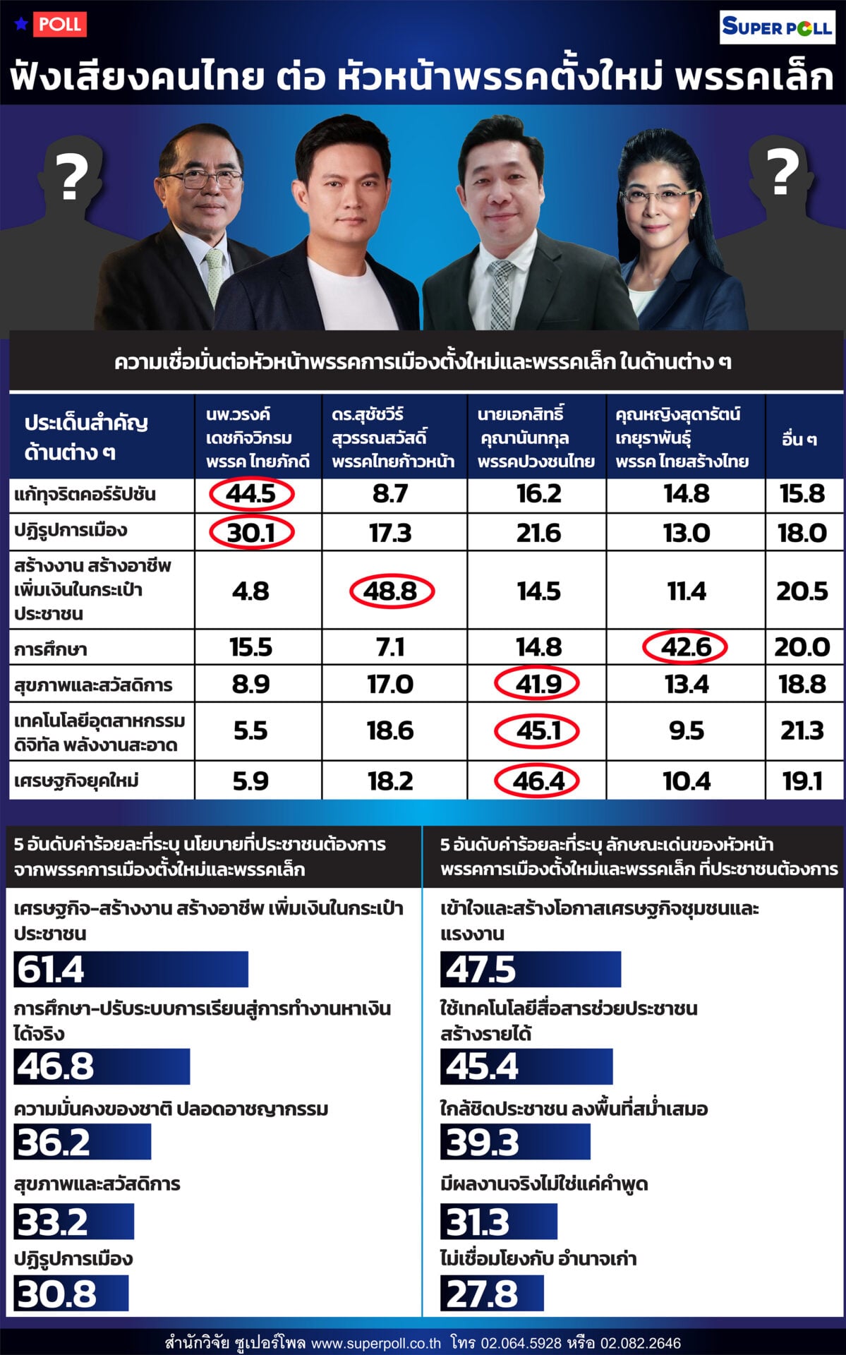 ที่น่าสนใจคือ ศักยภาพของหัวหน้าพรรคการเมืองตั้งใหม่และพรรคเล็ก สะท้อนความเชื่อมั่นเฉพาะทางที่แตกต่างอย่างมีพลัง ซึ่งเป็นหนึ่งในประเด็นสำคัญที่ปรากฏชัดจากการสำรวจโดยสำนักวิจัยซูเปอร์โพลนี้ คือ ความเชื่อมั่นของประชาชนต่อหัวหน้าพรรคการเมืองตั้งใหม่และพรรคเล็กในประเด็นเฉพาะทาง ซึ่งเผยให้เห็นว่า ผู้นำแต่ละคนมีภาพลักษณ์และจุดแข็งที่แตกต่างกันอย่างชัดเจน ทั้งในเชิงนโยบาย ความสามารถ และการยอมรับจากประชาชนในวงกว้าง