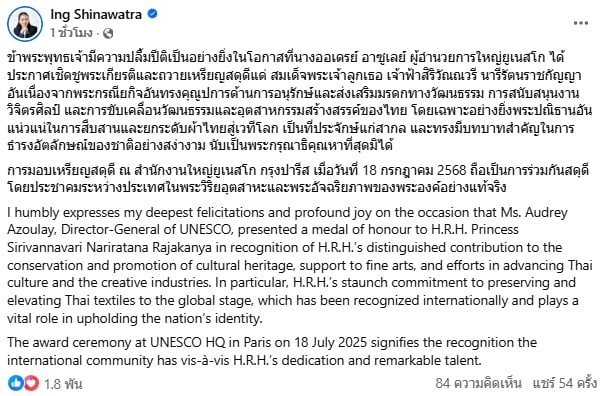 22 ก.ค. 2568 – น.ส.แพทองธาร ชินวัตร นายกรัฐมนตรีและรมว.วัฒนธรรม โพสต์ข้อความผ่านเฟซบุ๊กว่า ข้าพระพุทธเจ้ามีความปลื้มปีติเป็นอย่างยิ่งในโอกาสที่นางออเดรย์ อาซูเลย์ ผู้อำนวยการใหญ่ยูเนสโก ได้ประกาศเชิดชูพระเกียรติและถวายเหรียญสดุดีแด่ สมเด็จพระเจ้าลูกเธอ เจ้าฟ้าสิริวัณณวรี นารีรัตนราชกัญญา อันเนื่องจากพระกรณียกิจอันทรงคุณูปการด้านการอนุรักษ์และส่งเสริมมรดกทางวัฒนธรรม การสนับสนุนงานวิจิตรศิลป์ และการขับเคลื่อนวัฒนธรรมและอุตสาหกรรมสร้างสรรค์ของไทย โดยเฉพาะอย่างยิ่งพระปณิธานอันแน่วแน่ในการสืบสานและยกระดับผ้าไทยสู่เวทีโลก เป็นที่ประจักษ์แก่สากล และทรงมีบทบาทสำคัญในการธำรงอัตลักษณ์ของชาติอย่างสง่างาม นับเป็นพระกรุณาธิคุณหาที่สุดมิได้