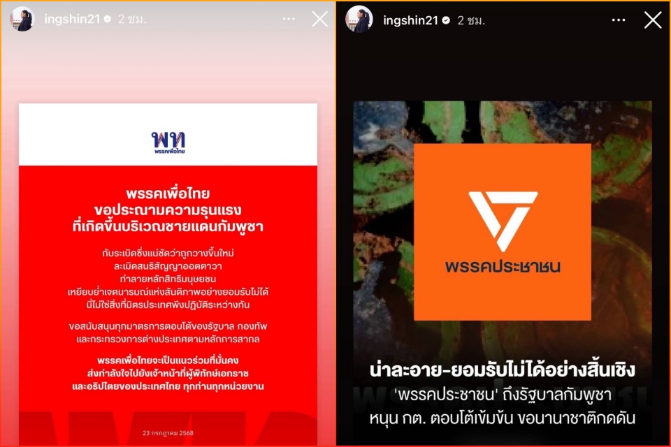 'อิ๊งค์' แชร์สตอรี่ แถลงการณ์ 'เพื่อไทย' ประณามรุนแรงชายแดนกัมพูชา พร้อมข้อความข่าวพรรค ปชน.หนุน กต. ตอบโต้เข้มข้น ขอนานาชาติกดดัน
