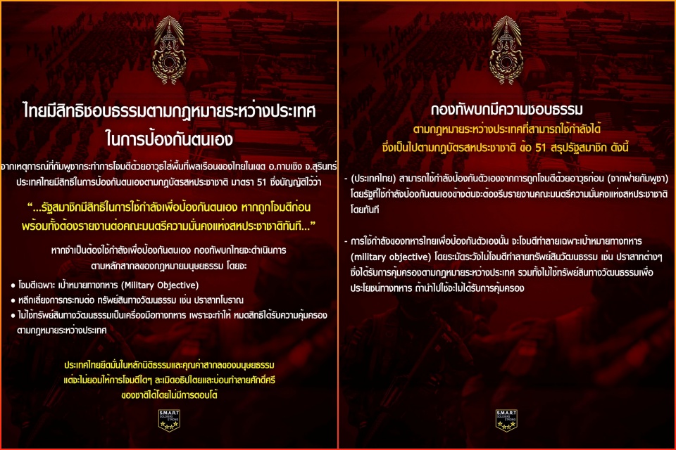 ประเทศไทยยึดมั่นในหลักนิติธรรมและคุณค่าสากลของมนุษยธรรม แต่จะไม่ยอมให้การโจมตีใด ๆ ละเมิดอธิปไตยและบ่อนทำลายศักดิ์ศรีของชาติได้โดยไม่มีการตอบโต้